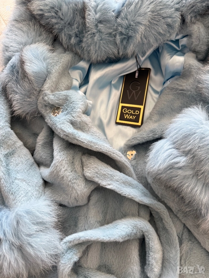 Луксозно светлосиньо палто ,качулка с лисица.