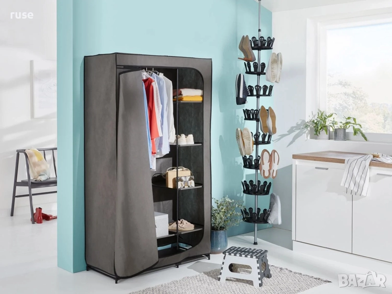 Текстилен гардероб с лост и рафтове. Изработен от дищаща материя за защитено от прах и сигурно съхранение на текстилни изделия. Стабилна носеща конструкция, с много лесен монтаж. Изключително удобен, функционален и мобилен поради лекотата си.