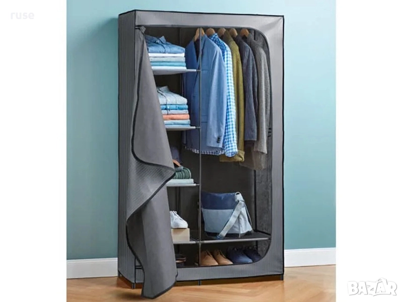 Текстилен гардероб с лост и рафтове. Изработен от дищаща материя за защитено от прах и сигурно съхранение на текстилни изделия. Стабилна носеща конструкция, с много лесен монтаж. Изключително удобен, функционален и мобилен поради лекотата си.