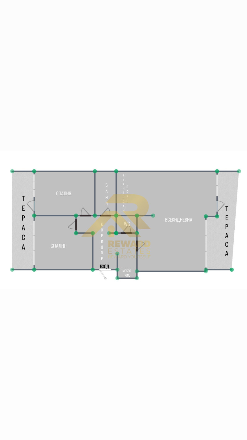 Разпределението на имота включва входно антре, просторна всекидневна с кухненски бокс, две спални, баня с тоалетна, отделна тоалетна, мокро помещение и две тераси.