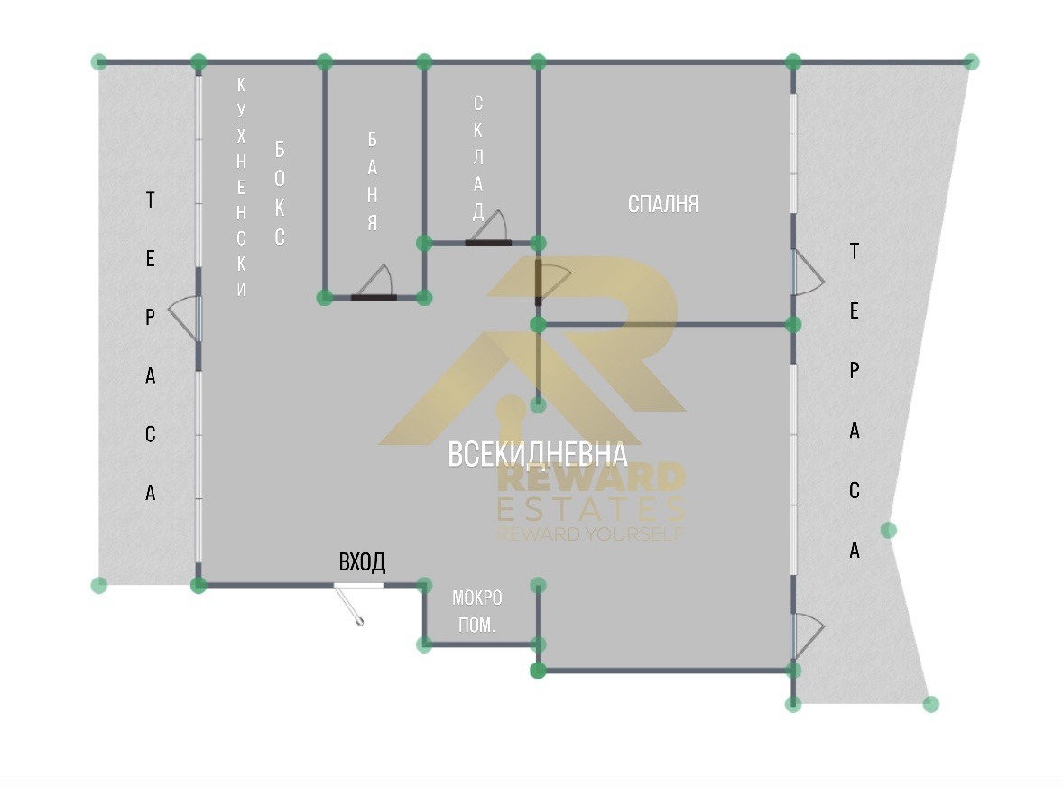 Разпределението на имота включва входно антре, просторна всекидневна с кухненски бокс, спалня, баня с тоалетна, складово помещение, мокро помещение и две тераси.