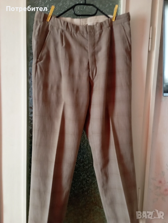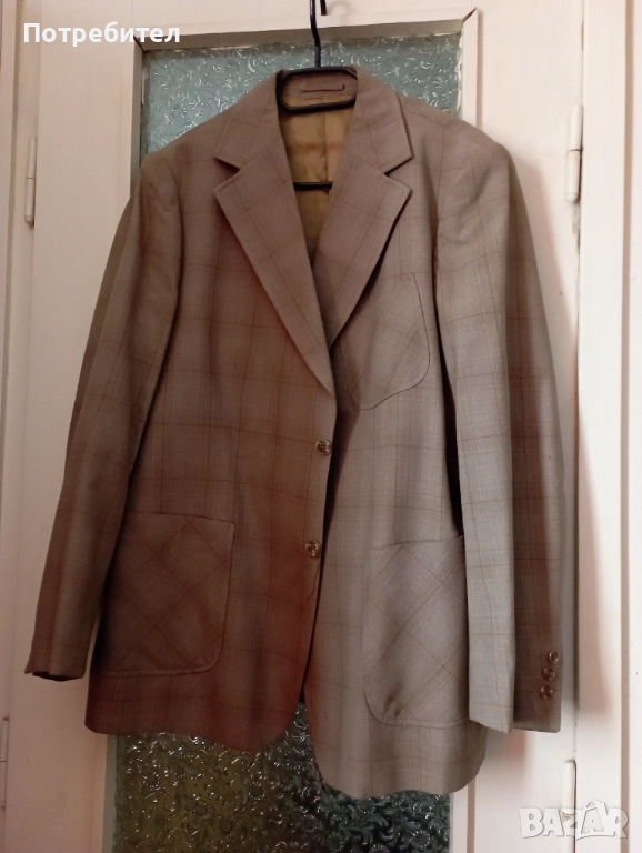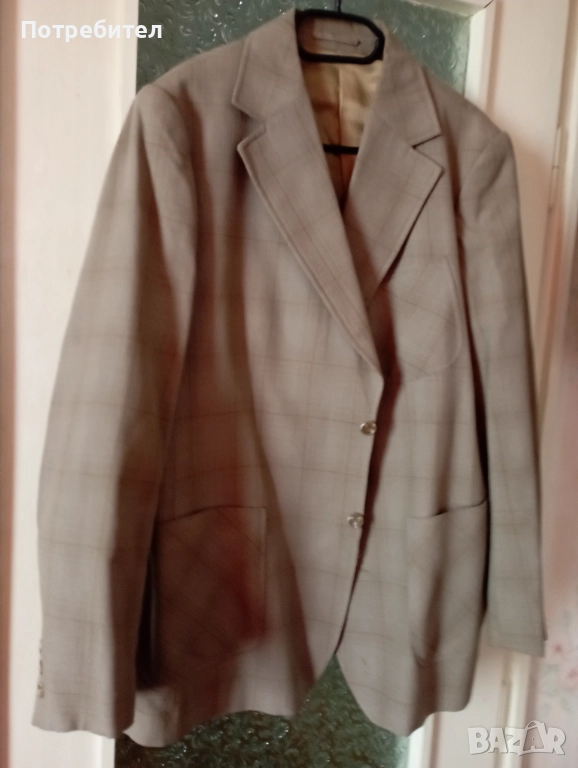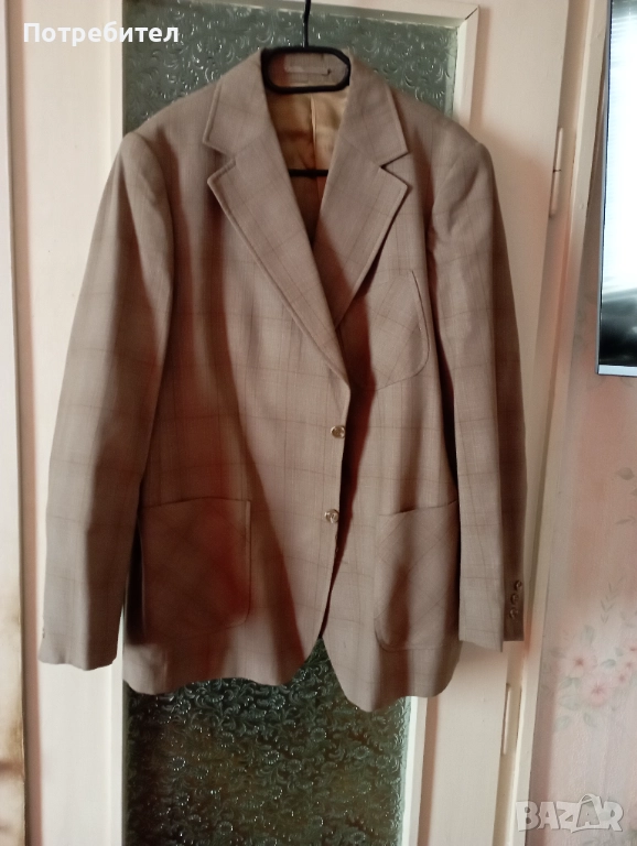 Продавам мъжки костюм, състоящ се от сако и панталон. Сакото е с хастар, външни и вътрешни джобове. Размерите на сакото са : ширина при раменете – 45 см; ширина от мишница до мишница – 58 см; дължина – 81 см; дължина на ръкава – 63 см. Панталона се закопчава с копчета; стандартни джобове + джоб отзад / с капаче/. Размери на панталона: талия – 88 см; ханш – 110 см; дължина – 100 см;