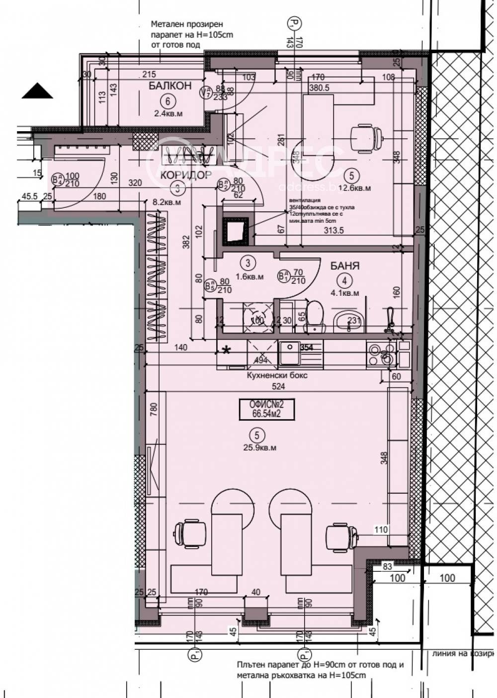 Двустаен офис състоящ се от: коридор, баня, склад, офисна площ с кухненски бокс, балкон и втора офис стая