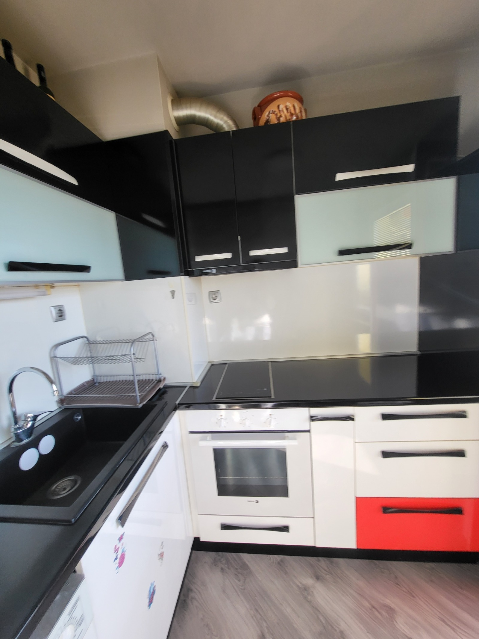 Кухня с трапезен кът, оборудвана с вградени уреди, удобен ъглов шкафов масив, пералня, хладилник и място за хранене.