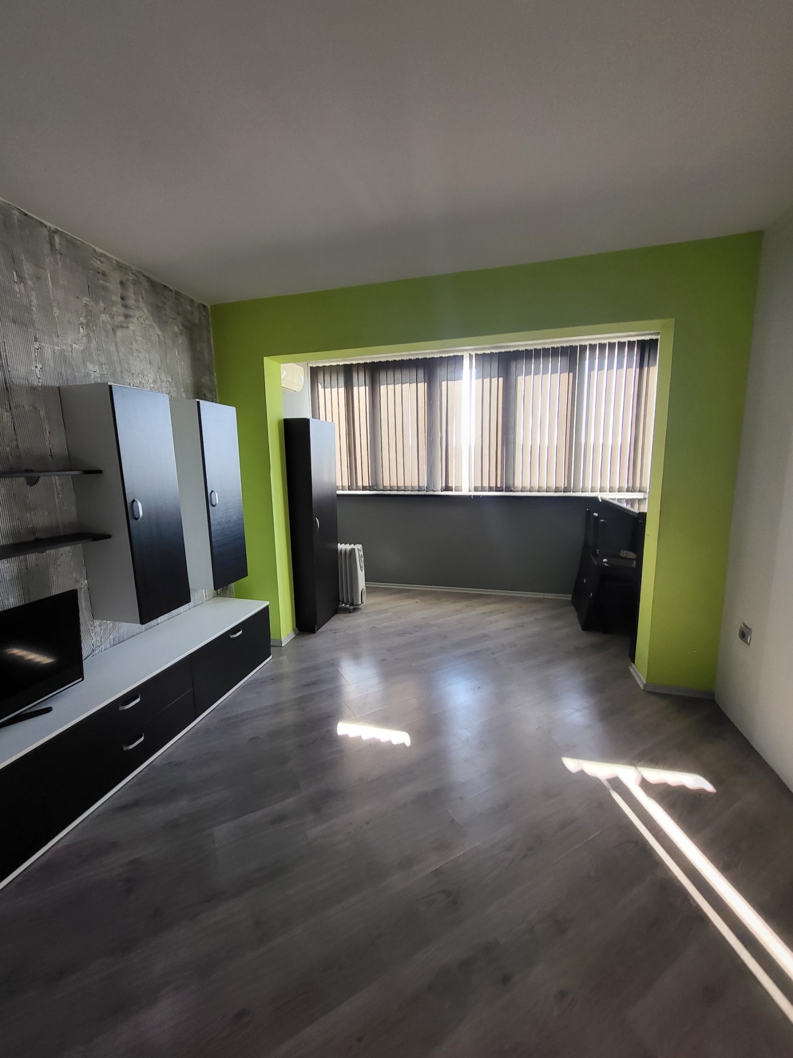 Просторна стая, обединяваща дневен кът и зона за спалня, с поставен ламинат и модерни стенни акценти. Налични са секция, гардероби и телевизор.