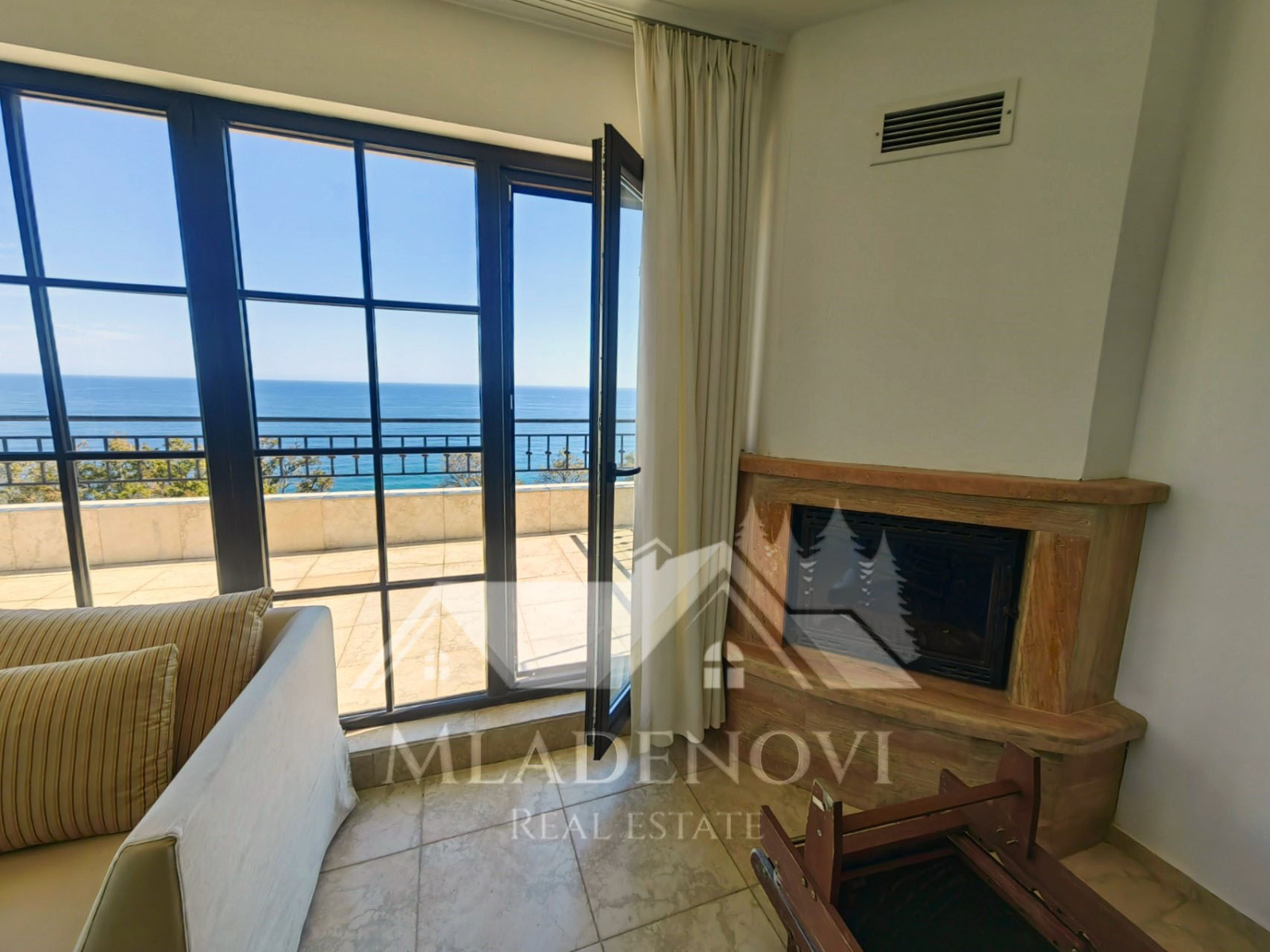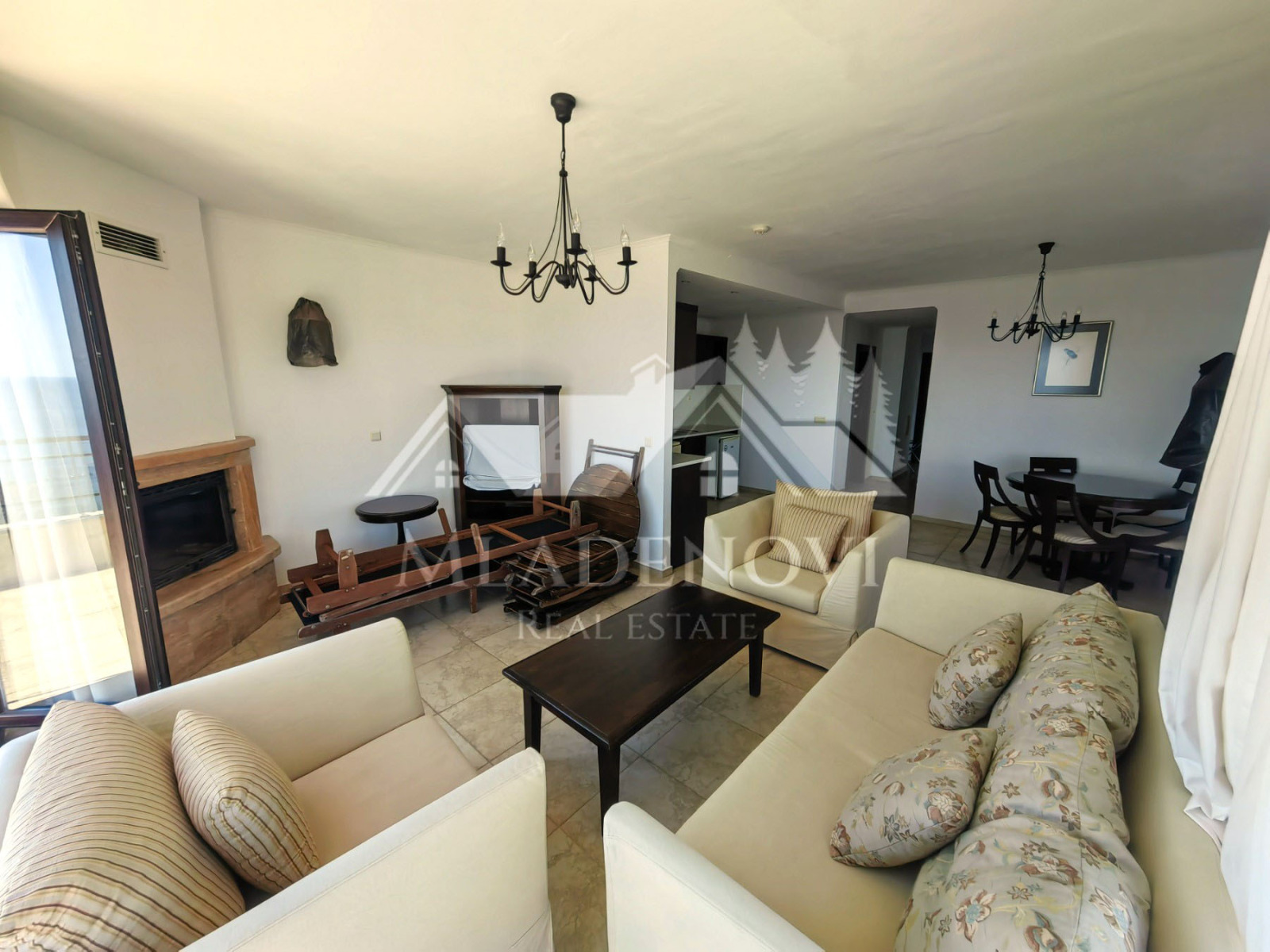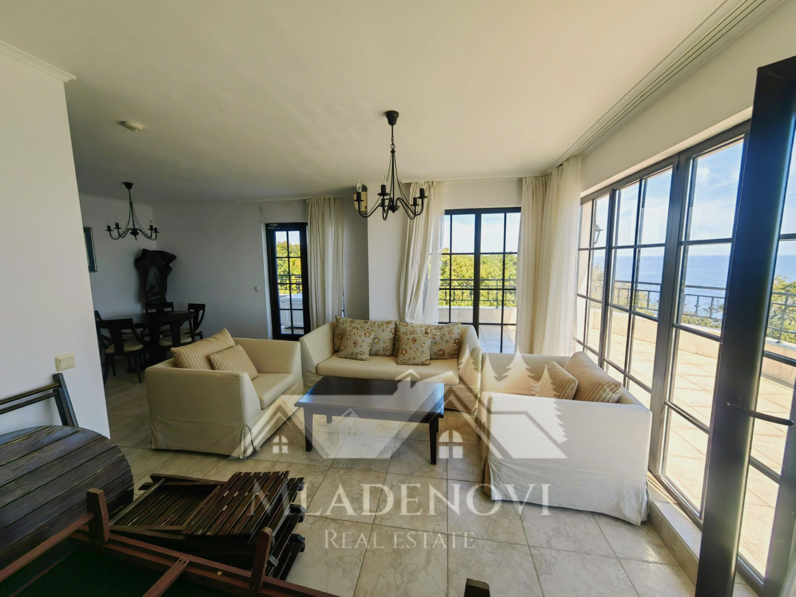 Жилището се състои от всекидневна с трапезария и кухненски кът, едно общо просторно помещение с камина и излаз на голяма открита тераса, три спални, едната, от които със собствен санитарен възел и джакузи, втора голяма баня с тоалетна и още две открити тераси. Жилището е изключително светло и слънчево, с три изложения и неповторима гледка. Продава се с наличното обзавеждане и оборудване. Таксата поддръжка е 12,90 Евро на кв.м. годишно.
