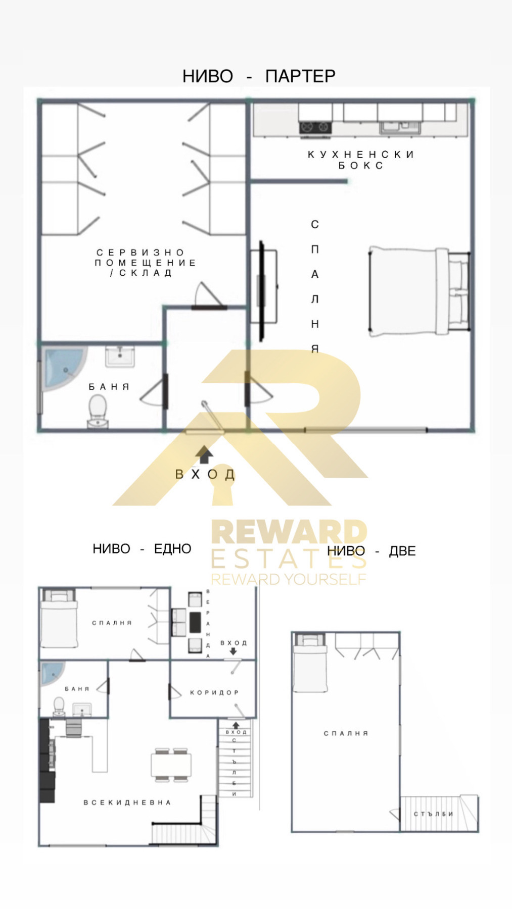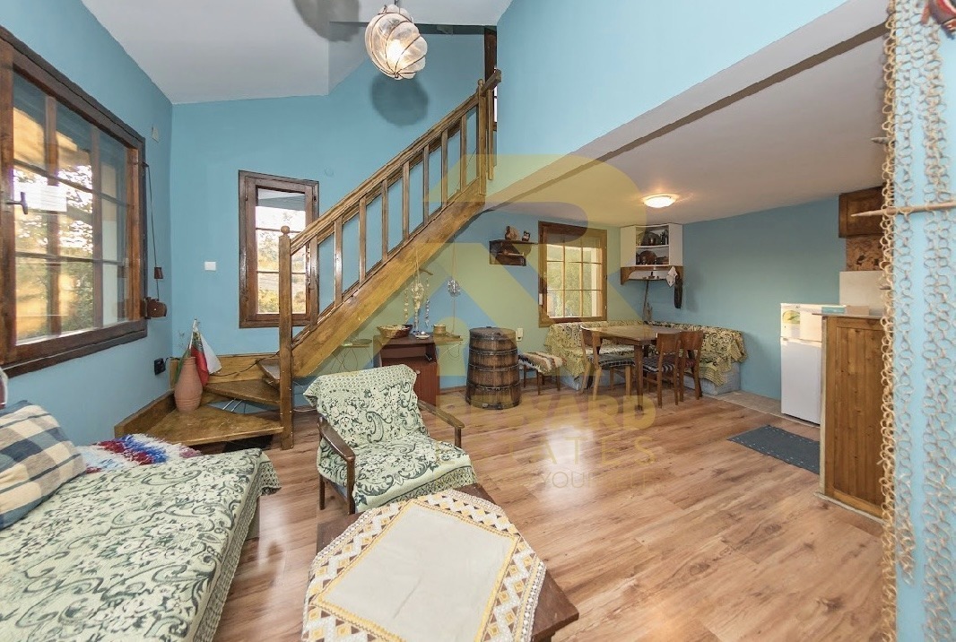 ПАРТЕРЕН ЕТАЖ - стая за гости с кухненски бокс, обслужващо помещение/склад и баня с тоалетна.