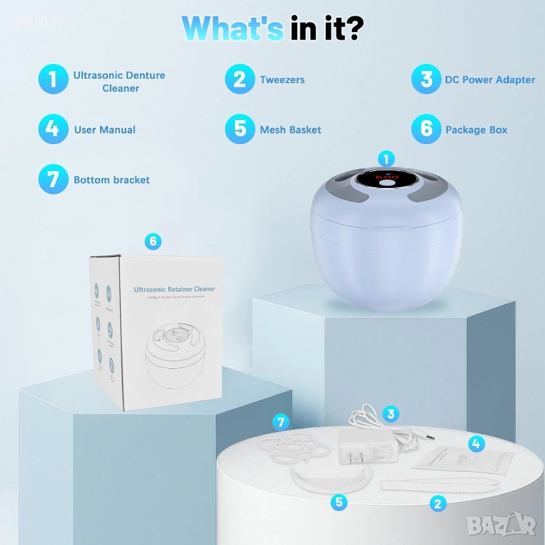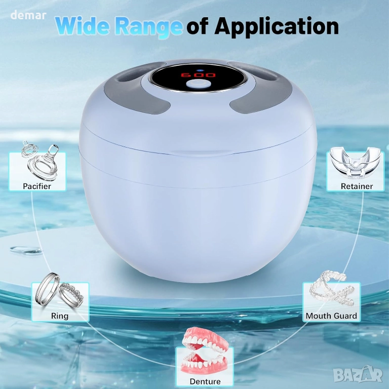 Ултразвуковата почистваща машина TechKen осигурява дълбоко почистване, използвайки високочестотна технология, която достига до труднодостъпни зони, за да премахне ефективно петната. Тя е подходяща за множество орални артикули, включително алайнери, ретейнери, протези, протектори за уста, предпазители за захапване, устройства за сънна апнея и глави за четки за зъби, намалявайки нуждата от отделни почистващи препарати. Лесното управление с един бутон я прави лесна за употреба, а компактният ѝ размер се побира удобно на повечето плотове в банята или в малки пространства за съхранение.
