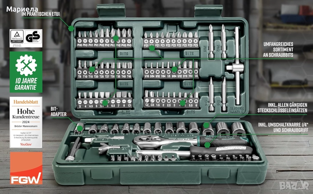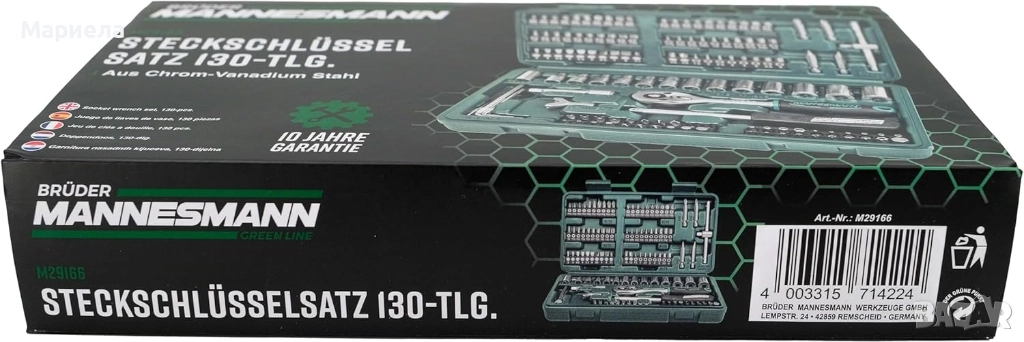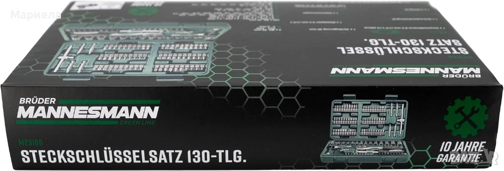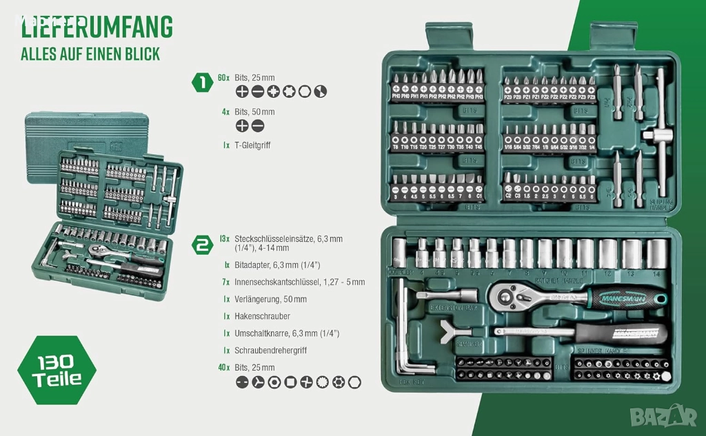 Изображението показва две еднакви кутии с комплект от 130 вложки и битове Brüder Mannesmann . Това е комплект инструменти, изработени от хром-ванадиева стомана.