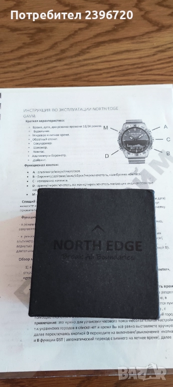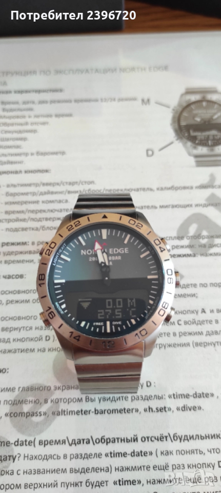 Часовника е за свободно гмуркане и шнорхелинг. НЕ Е водолазен компютър.Силиконовата верижка е удобна за върху неопрен. Показва дълбочина и температура на околната среда. Несполучлив подарък ми е и само седи в чекмеджето. Има много функции. Загубих упътването и сега го предлагам с изтеглен и разпечатан менюал на руски и оригиналния на notrh edge. В You tube има много клипчета за настройката му. Има и опция "изключен". Удобно е ако се ползва само за гмуркане.На последната снимка е в режим "гмуркане". Само лично предаване или наложен платеж с куриер. Не ми губете времето с други предложения за начин на плащане!!!