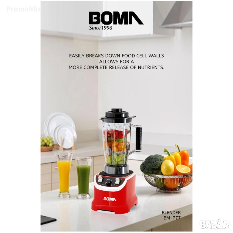 Boma BM 777 е кухненски уред, който комбинира 6 уреда в 1, като разполага с кана за блендиране и смесване, чопър с приставка за фреш и мелничка за кафе, ядки и др.