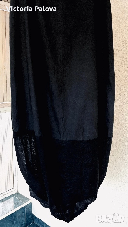 Истинско произведение на модерния минимализъм с нотка на авангард. Луксозна материя обгръща тялото с права строга линия отгоре, за да се разкрехне долу в драматичен балон - ефект. Подплатата се подава от долния ръб , усуквайки се като обърнато цвете или лека пухкавина, която създава нова форма - никога не еднаква - понякога изглежда като пухкава волана, друг път като тайнствена драперия - истински архитектурен елемент, който превръща обикновен черен цвят в нещо запомнящо се. Полата е била в ограничени бройки и не се преиздава, тя е единствена, втора такава просто не съществува. Марката AIZEL ARTICLES е лукс, който се нарежда до THE ROW и TOTÊME, но е още по- ексклузивна и скъпа, оригиналната ѝ цена е 540$. Талия - 38см, дължина - 104см, ханш - 55см.