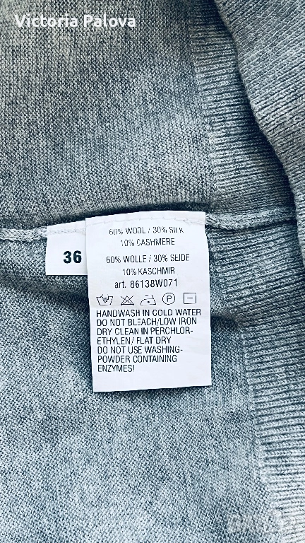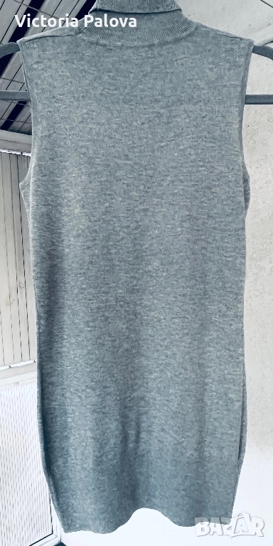 Луксозна марка, известна с изключителните си плетива - поло без ръкави с чист естествен състав : 60% вълна, 30% коприна , 10% кашмир. Това е изделие от най- висок клас - тъканта е невероятно лека , мека, топла, комфортна. Цената е висока , защото е чист лукс ( около 400лв), коприна и кашмир. “ Който веднъж го облече, разбира защо струва толкова”. ГО - 43см, дължина - 70см.