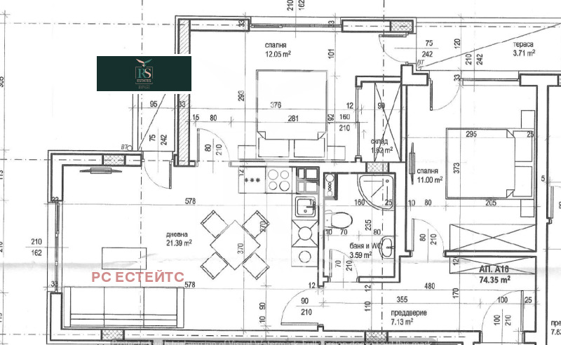 Апартаментът е със застроена площ 74,34 кв.м. и обща площ 84,22 кв.м., като включва: