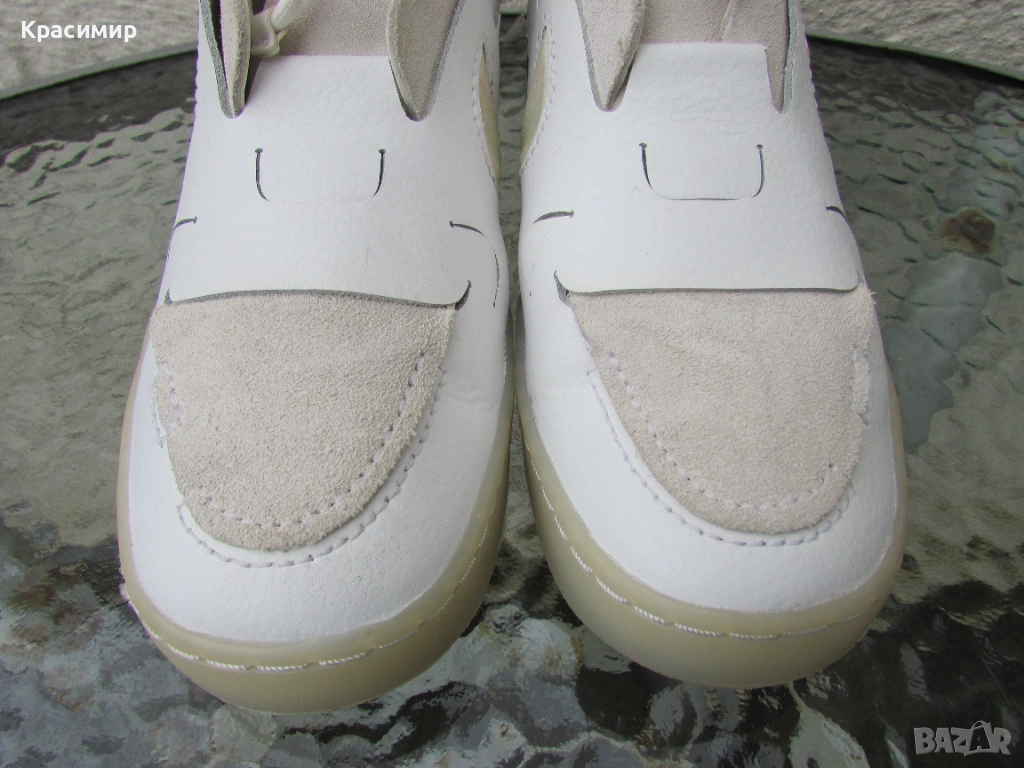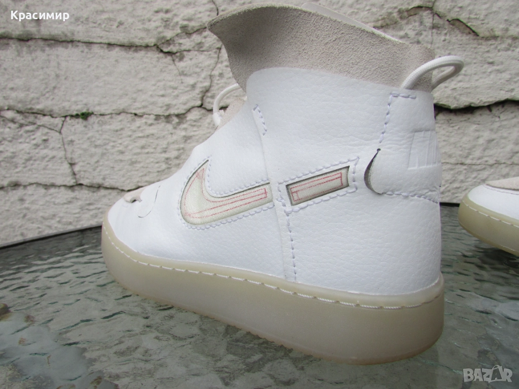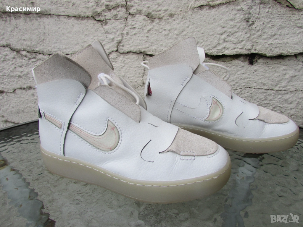 Дамски кецове Nike Vandalised „Summit White“, е ексклузивен модел с класически дизайн, издръжлива конструкция, уникална визия и изрязани детайли странично отпред и на петата. Изработени са от естествена кожа и велур в горната част, скрити връзки за стягане, езиче за издърпване на петата за бързо обуване, мека подплата за удобство и гумена подметка с кръгъл дизайн за издръжливост и сцепление. За повече здравина подметката е фабрично шита по цялата дължина. Високият им дизайн обгръща глезена, добавяйки опора и осигурявайки удобно прилягане, а системата за връзване, позволява бързо регулиране. Номер 37 с дължина на стелката 23 см. Кецовете са в перфектно състояние.