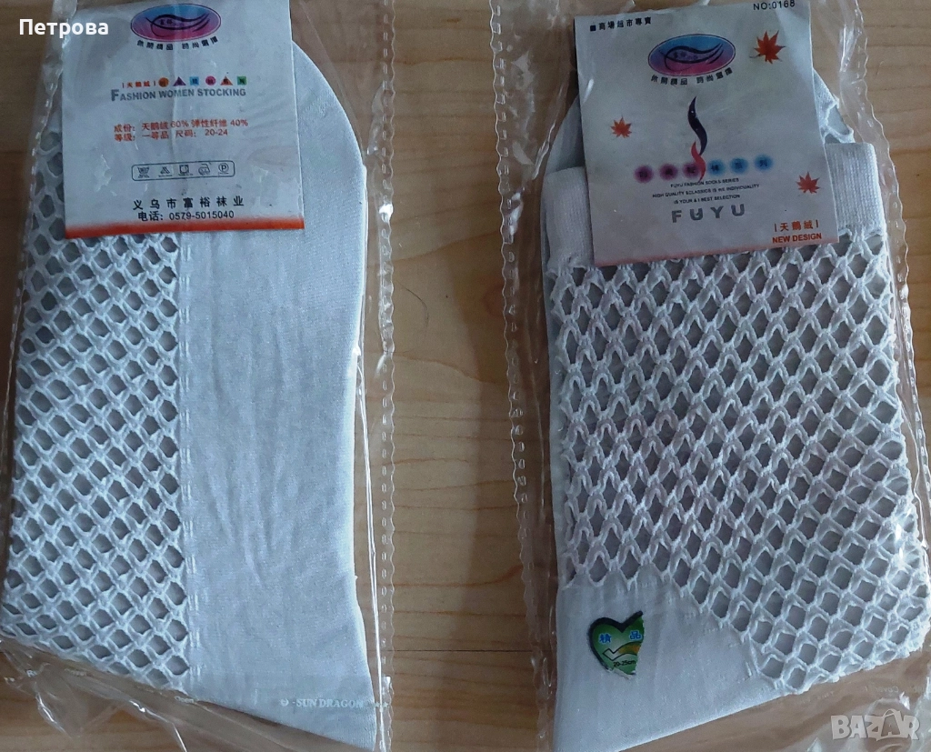 Осем чифта чорапи, единична цена 4 лв. в оригиналните запечатани опаковки – подходящ подарък за НГ – памучни, бамбукови, ликра, комфортни и здрави, оригинални, различни цветове и структура, за всички вкусове в семейството, размер 20-24. При закупуване и на осемте чифта – отстъпка, обща цена 30 лв. Изпращат се с 10 % отстъпка от общоприетата такса на куриерските служби.