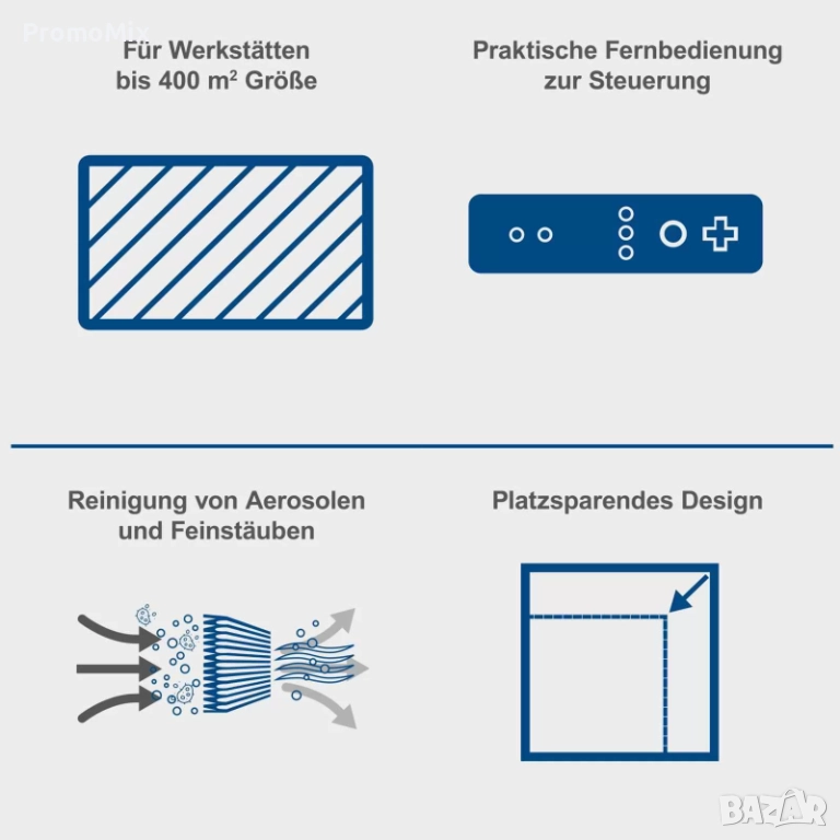 пречиствател на въздух, подходящ за работилници и др. работни помещения, осигуряващ високоефективно пречистване на площ до 400 m².