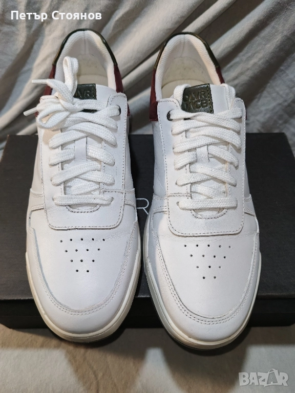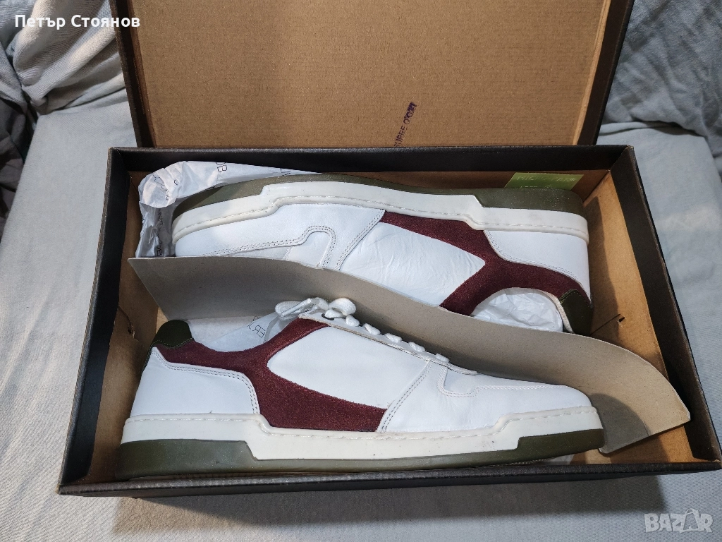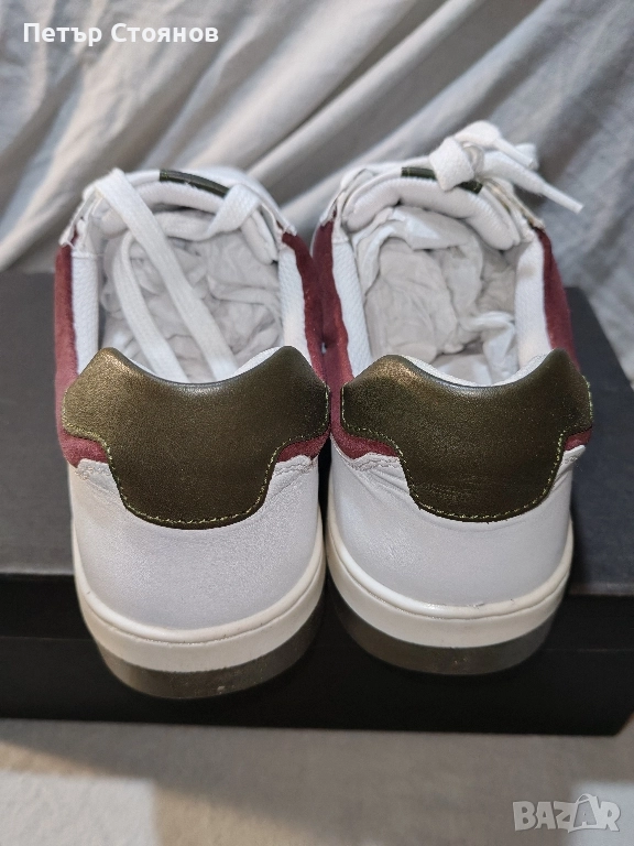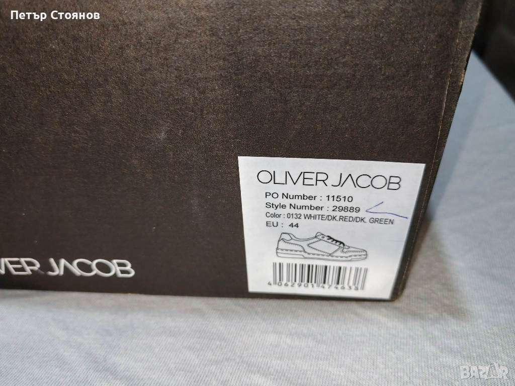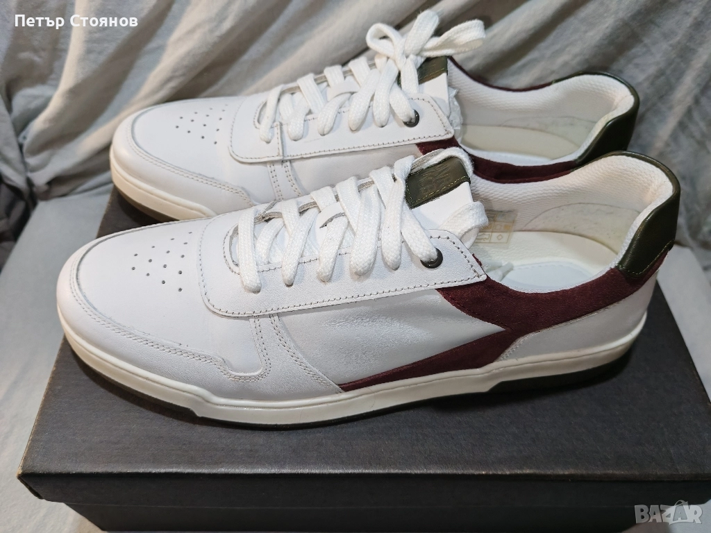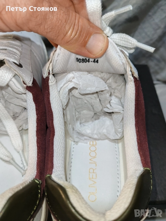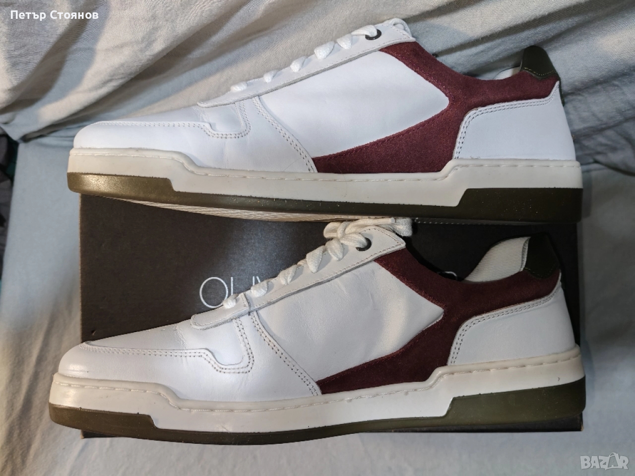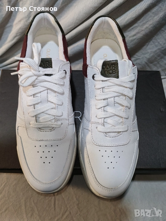 Предлагам чудесни мъжки сникърси на марката Oliver Jacob. Обувките са чисто нови, в кутия. Изработени са от бяла естествена кожа, в комбинация от естествен велур с цвят бордо. Хастарът и стелката са от естествена кожа и текстил, подметката е от полиуретан, шити и лепени. Дължината на стелката е 28.5 см, височината на подметката при петата е 3.5 см. Изпращам с избран от купувача куриер и възможност за преглед и тест.