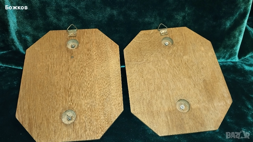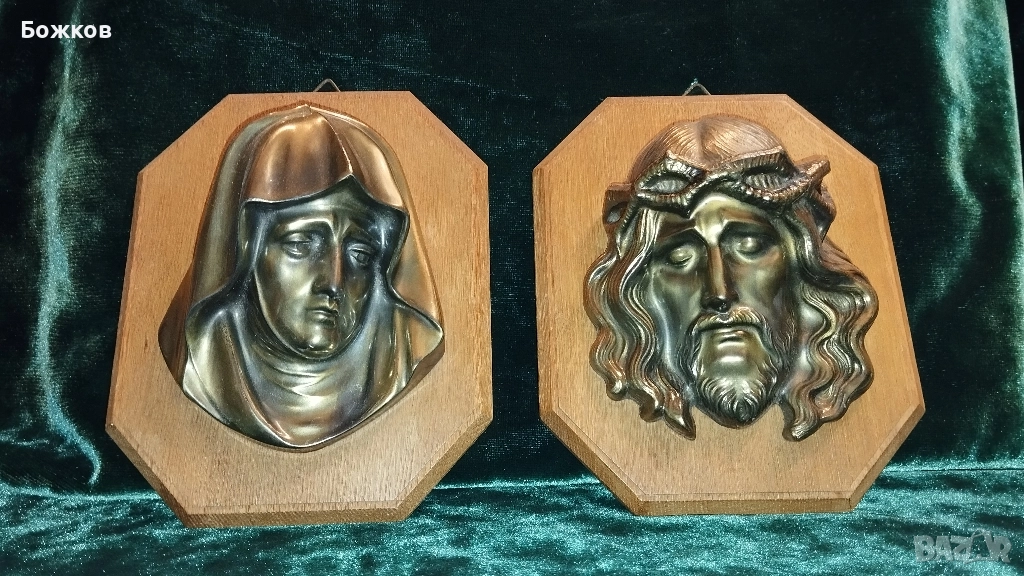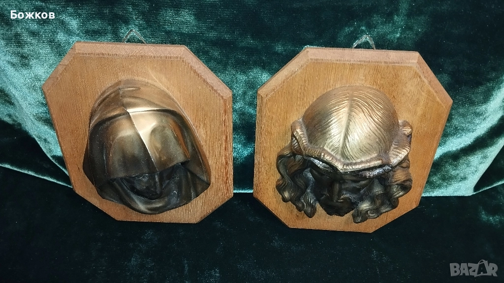 Две масивни месингови гравюри на Исус и Дева Мария. Монтирани са върху дъбова основа със закачалка. Продават се в комплект.