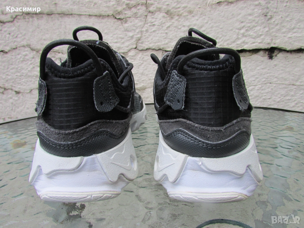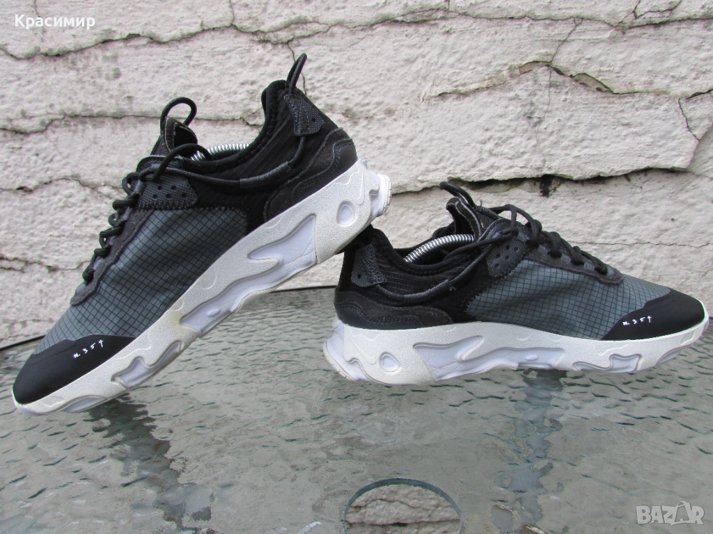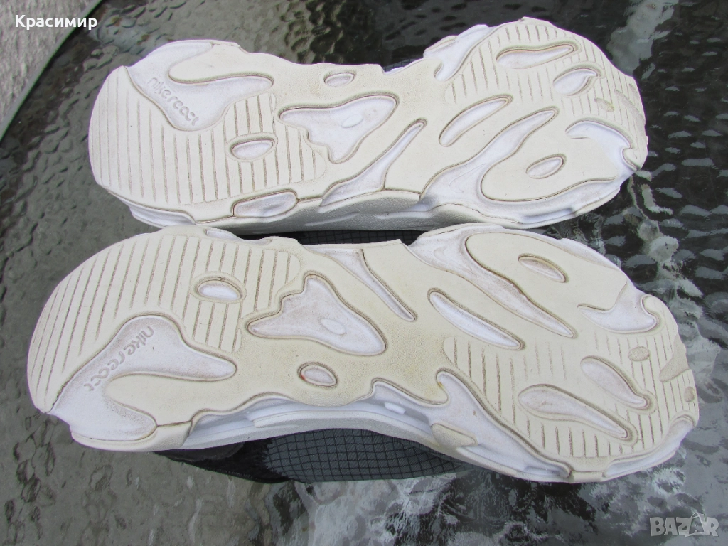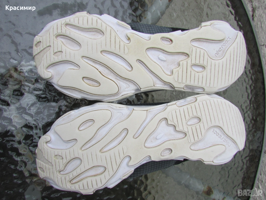 Мъжки маратонки Nike React Live, изработени от еластичен текстил и дишаща мрежа, в горната част подсилени от тонални наслагвания без шиене, за допълнителна издръжливост. Имат еластичен шнур на петата и езика за лесно обуване и събуване, лека конструкция, разположена върху междинната подметка от пяна React по цялата дължина, с пружиниращо омекотяване и гумена подметка за добро сцепление. Маратонките са подходящи за бягане и ежедневие, и са в много - добро състояние. Номер 41 с дължина на стелката 25,5 см. Произведени във Виетнам.