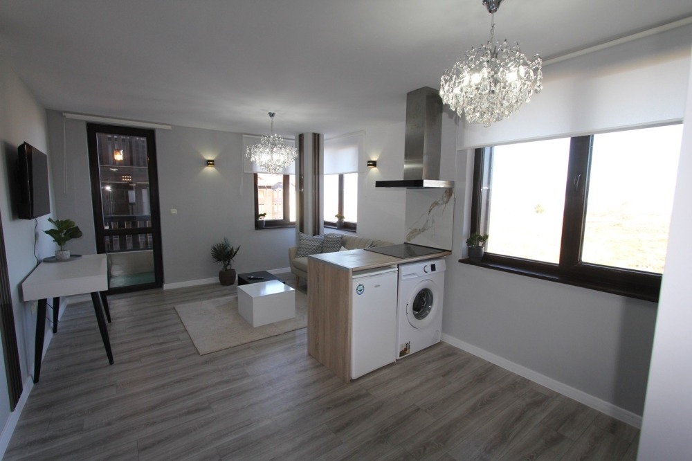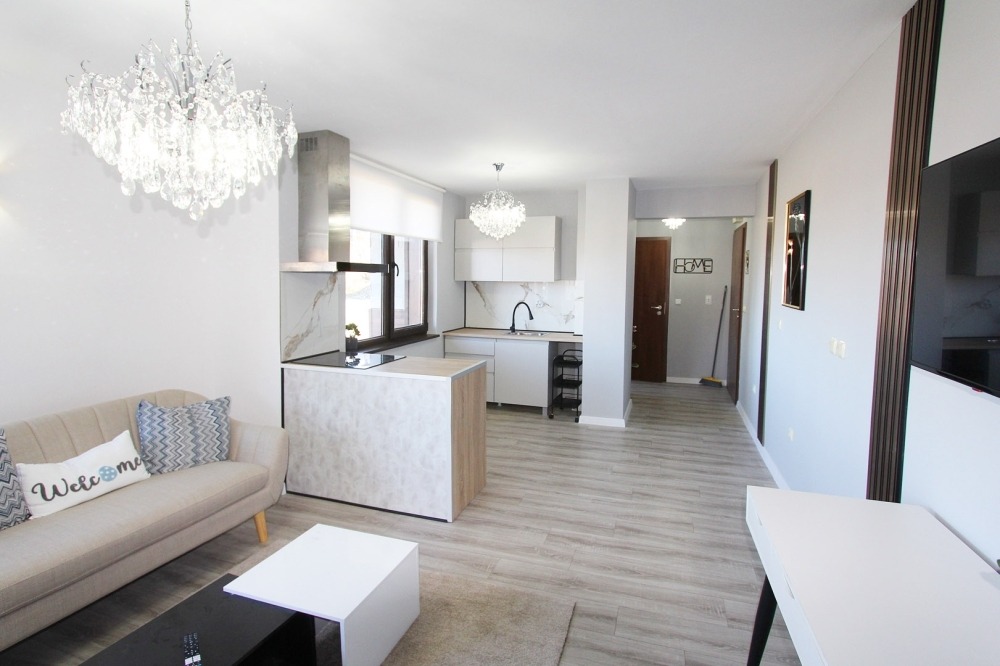 Холът е обзаведен с мека мебел и кухненския кът е оборудван с горни, долни шкафове, хладилник, пералня и ел.котлони. От него се излиза на балкон, който разкрива хубава гледка.