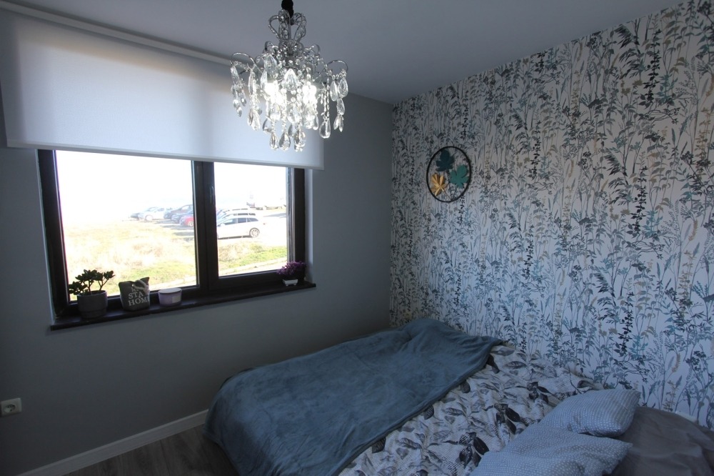 Спалня има двойно легло, две нощни шкафчета и гардероб.