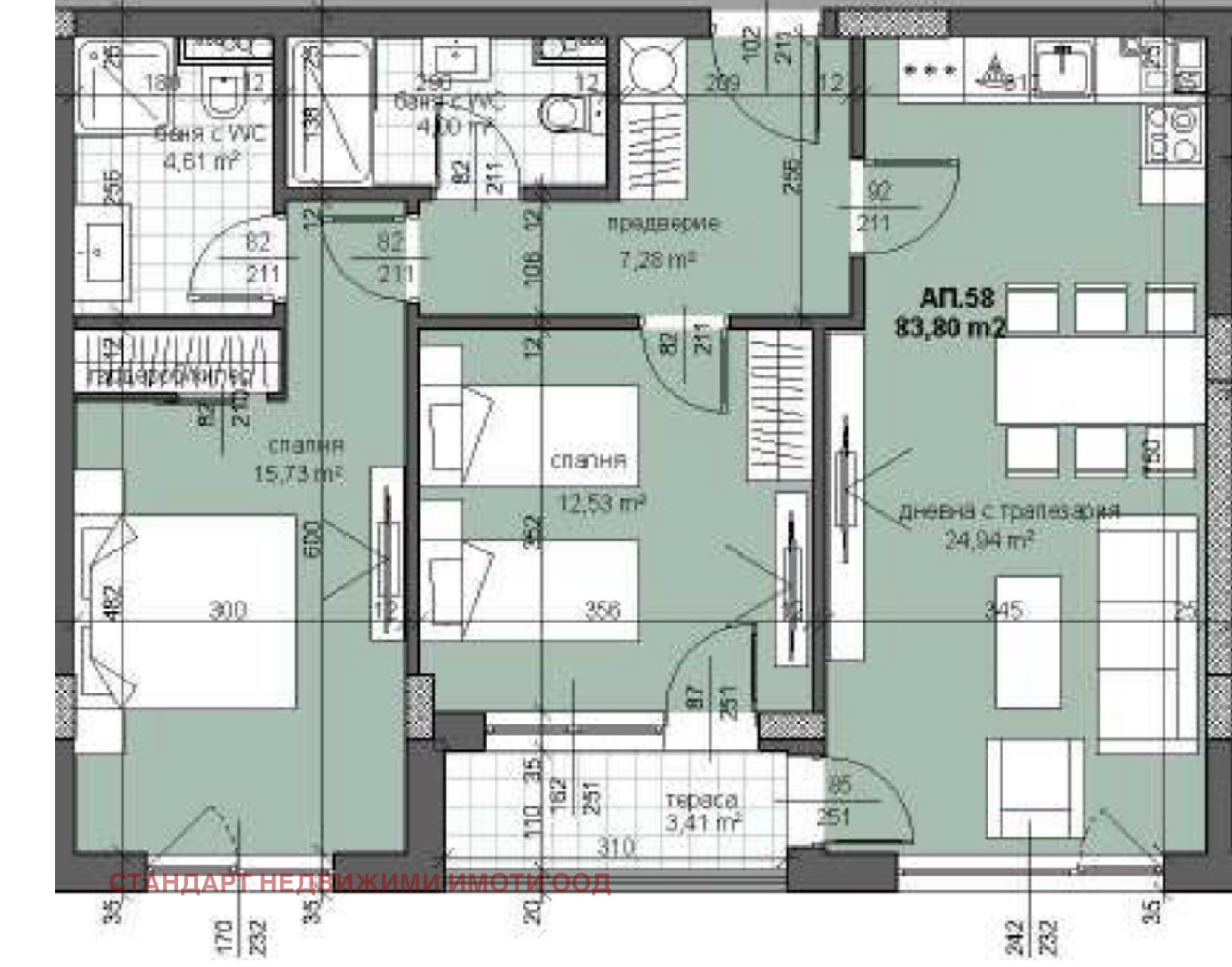 АПАРТАМЕНТ 34 ; ЕТАЖ: 4; КОТА: +9.00 м. сграда 30 застроена площ: 83,80 м2 състоящ се от: дневна с трапезария, две спални, килер, две бани с тоалетни и тераса; ВЕДНО със съответните на ОБЕКТА 1,515 % (едно цяло петстотин и петнадесет хилядни процента) идеални части от общите части на сградата, равняващи се на 13,08 м2 , с което общата площ на апартамента възлиза на 96,88 кв.м.
