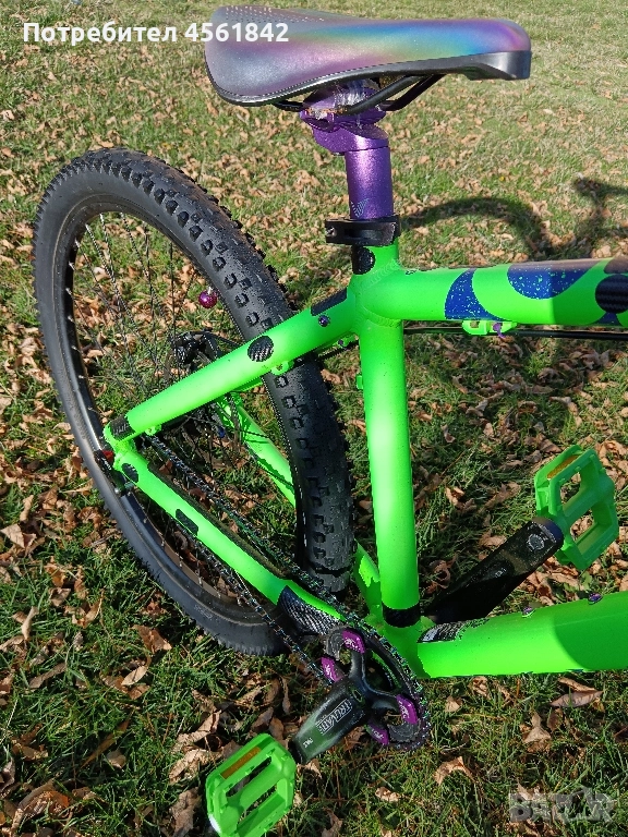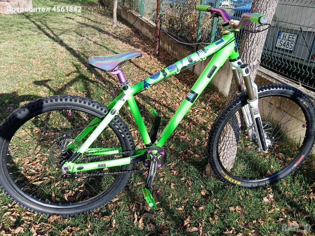 Рамка 17" Scott Voltage YZ20 с нови чашки. Въздушна вилка Rockshox Sektor Silver Air конусен стержен с 140mm ход, заключване и ребаунд 15х100 проходна ос. Хидравлична спирачка Shimano brm 446 Deore с ново масло и нови керамични накладки. Курбели на шлиц Truvative с нови пвц леки педали с вградени пинове. Нов сингълатор, верига, кормило, лапа, грипове, колче, седалка и други щуротии само в къстъм петролено- зелено - лилавата гама... Изцяло и само за твоя кеф!