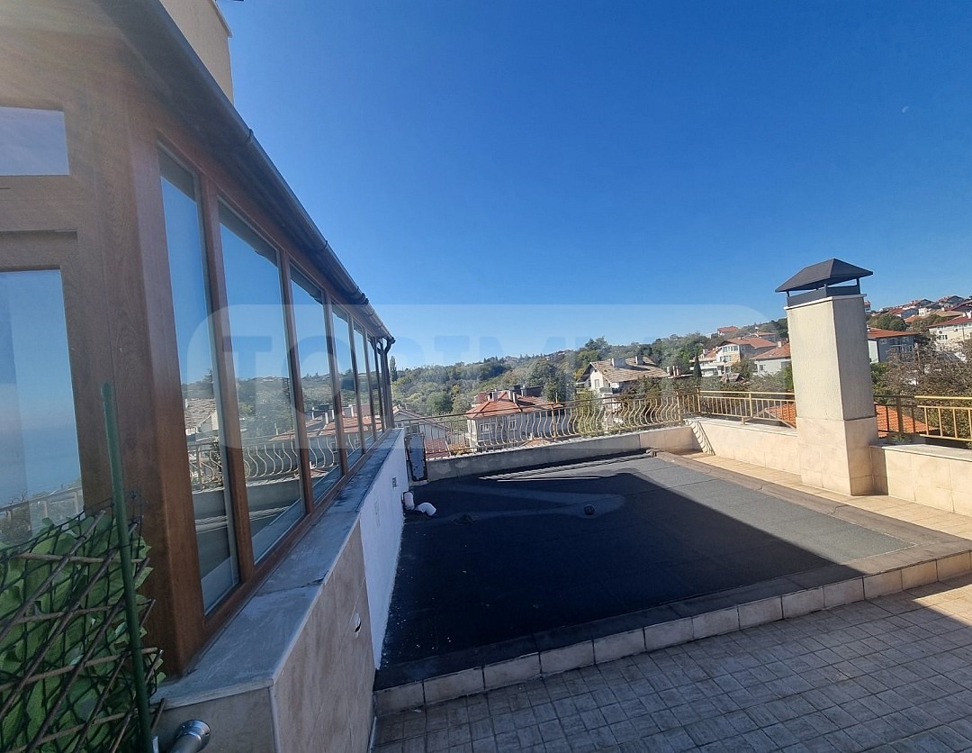 Имотът е разположен на пети етаж в тухлена сграда от висок клас, с невероятна панорама към града, морето и нос Калиакра. Разпределение: коридор, всекидневна с кухненска част и килер, спалня, втора спалня с дрешник, санитарен възел, две тераси с излаз от всяка стая, а на ет.6 панорамна тераса подходяща за лятна кухня/градина/барбекю или обособяване на трета спалня.