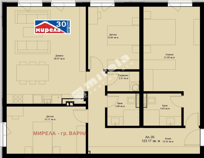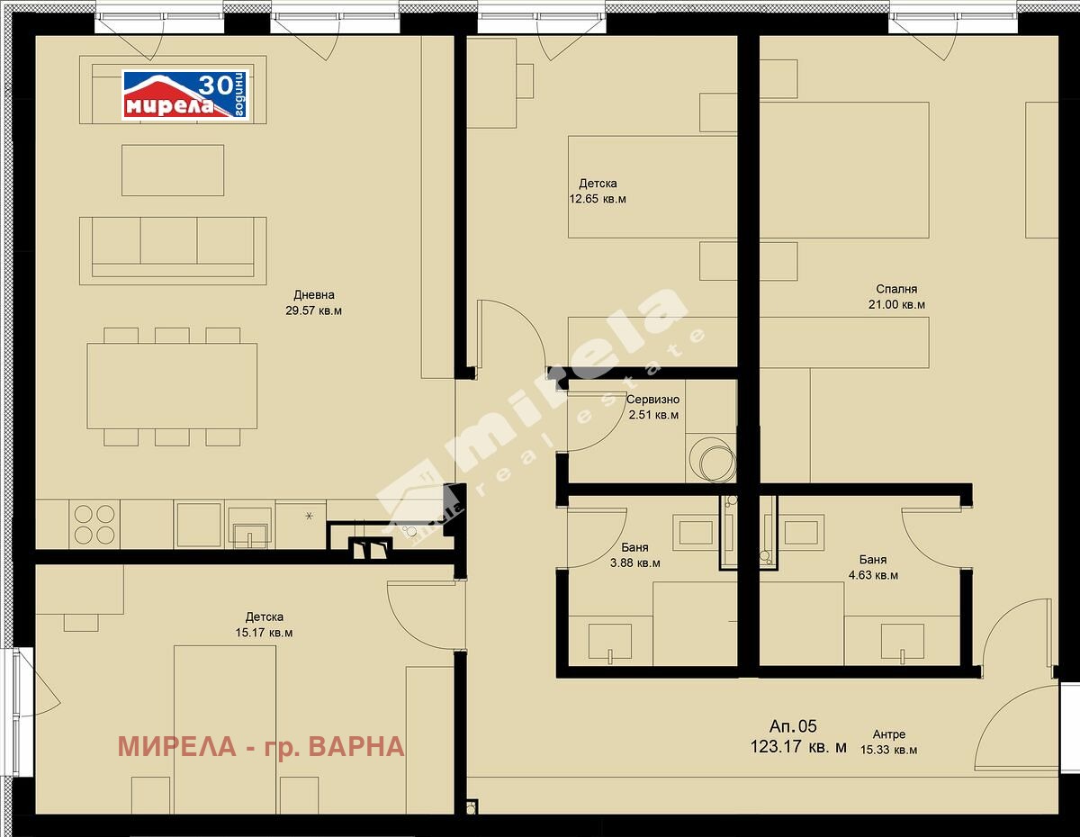 Апартаментът, който представяме с тази оферта има следното разпределение: антре, коридор, дневна с кухня, три спални, две бани, просторна лоджия.