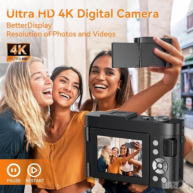 Цифрова камера 4K 48MP MaxMango с автофокус и 2.8'' въртящ се на 180° екран, 16x цифрово увеличение, акумулаторна компактна камера с 32G карта, влог камера за деца, тийнейджъри и начинаещи.