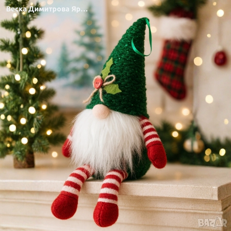 Материали: меки текстилни влакна, плюш, декоративни елементи; Размери: приблизително 10–15 см; Цветове: червен вариант и зелен вариант; Безопасност: подходящи за деца, без твърди и остри части; Допълнителни елементи: пухкава брада, раирани крачета, декоративна шапка; Подходящи за: елха, рафтове, подаръчна декорация, детски стаи; Опаковка: индивидуално фолирани – готови за подаряване.