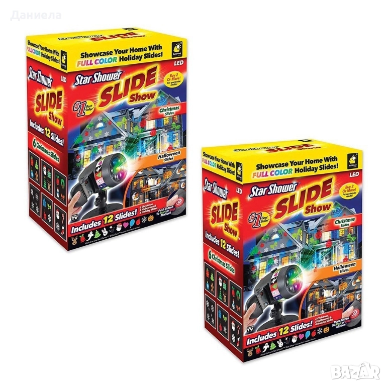 Прожектор Holiday slide / Лесна употреба; Влагоустойчив корпус; Различни фигурки за проекция; Стабилна основа; Подходящ за открито и закрито; Лесен за използване; Водоустойчив корпус; 2 скорости; Безопасен при сняг и дъжд; Заменя празничния декор за Коледа, Великден, Свети Валентин, Рождени дни, Хелоуин; Ярки LED светлини; Обхват до 300 кв/м.