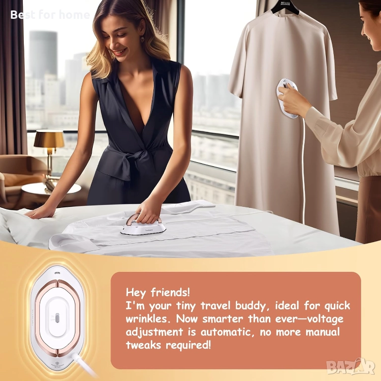 [Версия 2.0 Универсален спътник за пътуване]: Компактна и ефикасна, тази ютия Версия 2.0 100-240V с автоматично напрежение премахва гънки от опакован багаж за секунди, използвайки 300W PTC топлина. Идеална за бързо освежаване на ризи, рокли и платове за пътуване. Ултрапреносимият дизайн е подходящ за ръчен багаж, но не е за ежедневна употреба или големи дрехи. Забележка: За глобални контакти е необходим адаптер за щепсел.