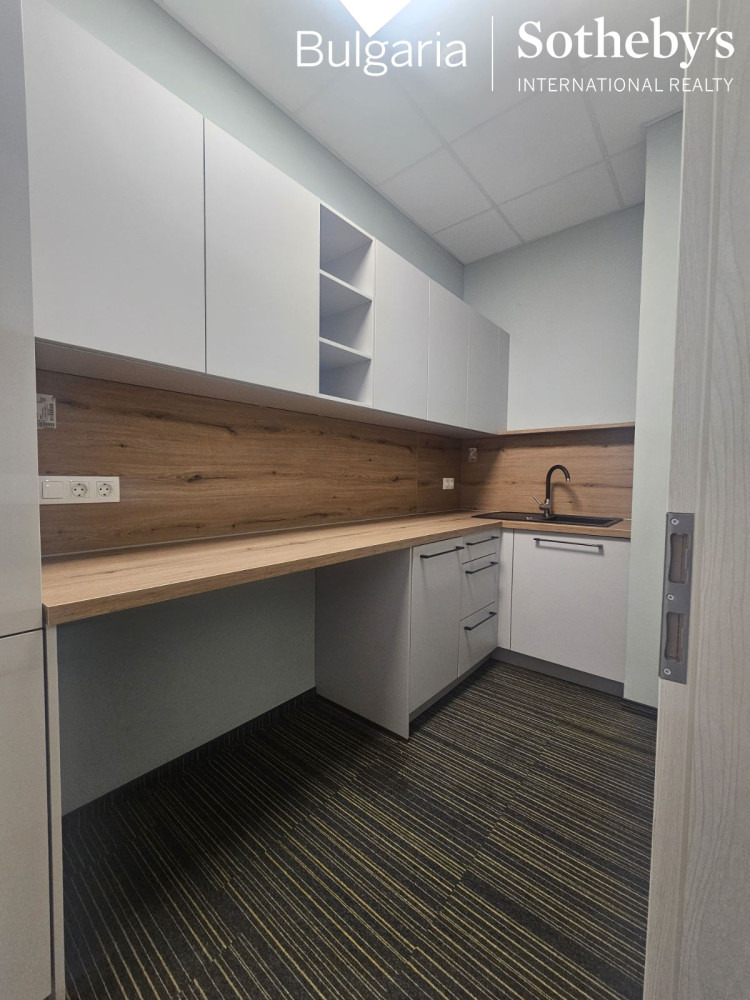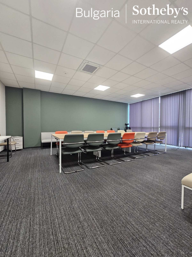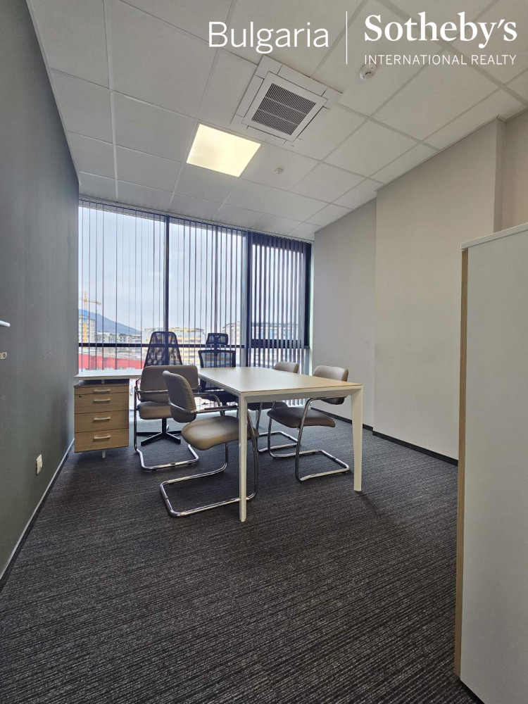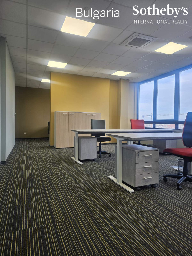 BULGARIA SOTHEBY’S INTERNATIONAL REALTY има удоволствието да представи на Вашето внимание изключително елегантно офис пространство, ситуирано в една от най-престижните и стратегически бизнес локации в града. Интериорът впечатлява с панорамни прозорци от под до таван, разкриващи вдъхновяващи гледки към градския силует и планинските контури – атмосфера, създадена за фокус, престиж и визия за развитие.Пространството е изпълнено със светлина и разполага с функционално open space разпределение, допълнено от самостоятелен мениджърски кабинет с изчистена, съвременна линия на обзавеждане.