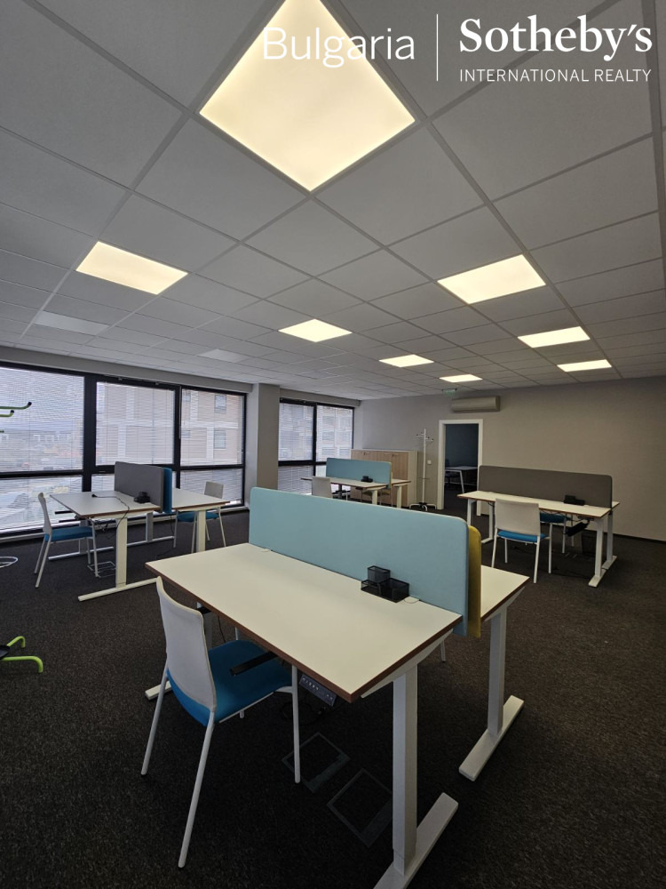 BULGARIA SOTHEBY’S INTERNATIONAL REALTY има удоволствието да представи на Вашето внимание изключително елегантно офис пространство, ситуирано в една от най-престижните и стратегически бизнес локации в града. Интериорът впечатлява с панорамни прозорци от под до таван, разкриващи вдъхновяващи гледки към градския силует и планинските контури – атмосфера, създадена за фокус, престиж и визия за развитие.Пространството е изпълнено със светлина и разполага с функционално open space разпределение, допълнено от самостоятелен мениджърски кабинет с изчистена, съвременна линия на обзавеждане.