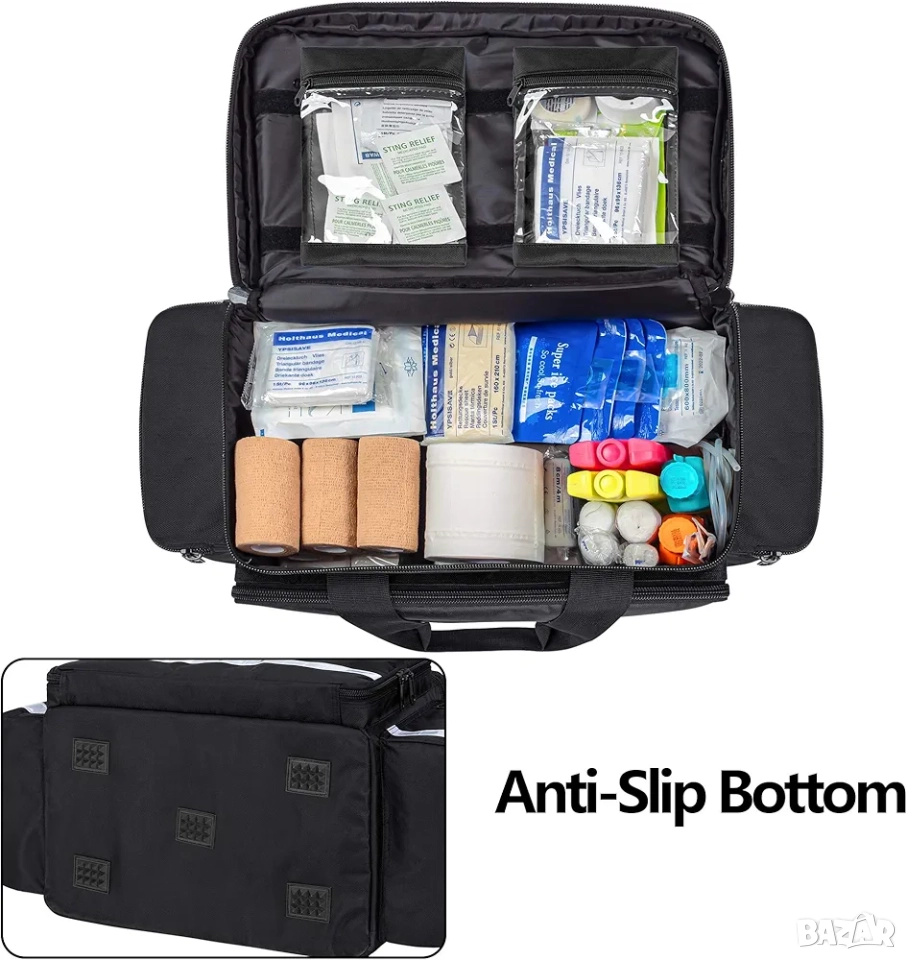 * Специализиран преден панел: Предният джоб се разтваря напълно, разкривайки органайзер с множество еластични примки и слотове, предназначени за сигурно фиксиране на медицински инструменти (ножици, пинсети, термометри, фенерчета и др.).