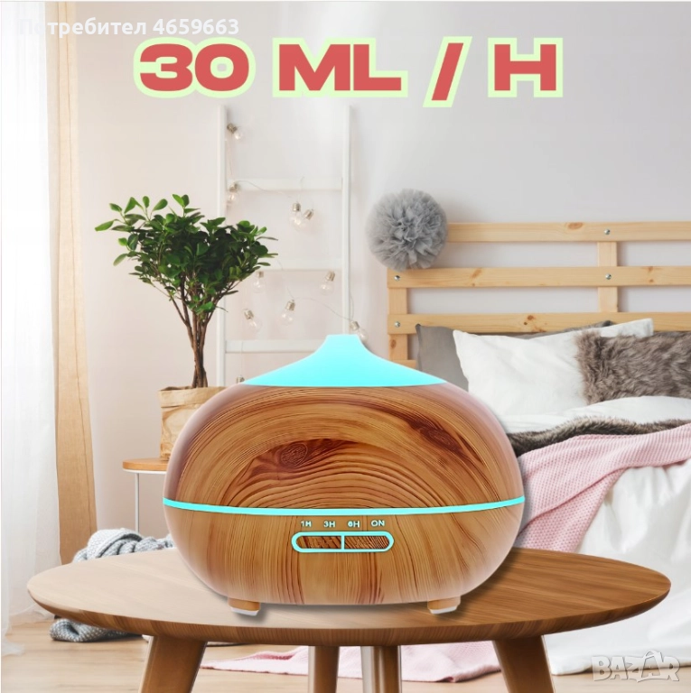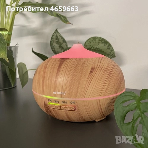 - АРОМАТЕРАПИЯ – устройството има и изключително полезна функция за ароматерапия. След като се добави маслото във водата, овлажнителят, освен че регулира нивото на влажност в стаята, също така освобождава аромати с релаксиращи свойства (позволени са само водоразтворими продукти – в противен случай овлажнителят може да се повреди). Комплектът включва 3 такива масла!