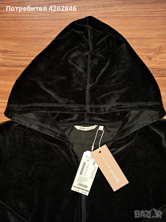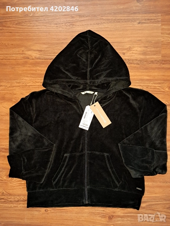 Оригинален дамски велурен суитчър с качулка и цип. Нов, с етикет. 82% памук и 18% еластан.