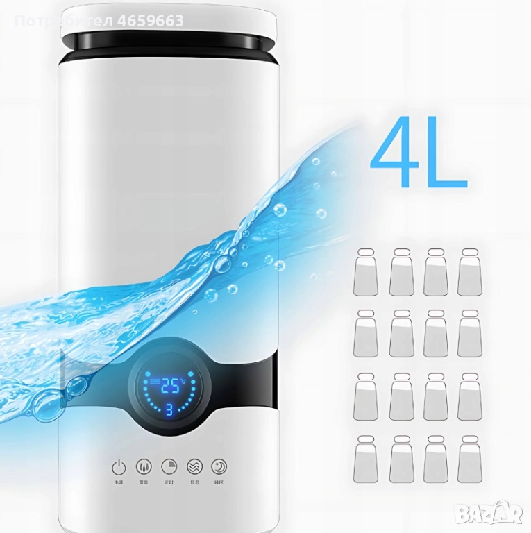 УЛТРАЗВУКОВ ОВЛАЖНИТЕЛ НА ВЪЗДУХА С ЙОНИЗАЦИЯ 4l + 3 АРОМАТНИ МАСЛА 22739