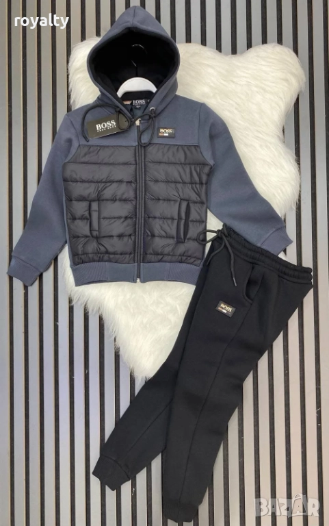 Стилен и топъл ватиран екип за момче, състоящ се от горнище с цип и качулка и долнище с ластичен колан. Горнището е с модерна комбинация от памучни ръкави и черен капитониран непромукаем плат, който осигурява допълнителна топлина и комфорт. Долнището е с джобове и лого детайл. Подходящ за ежедневие, училище, спорт и разходки.