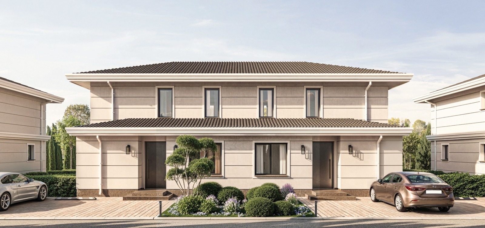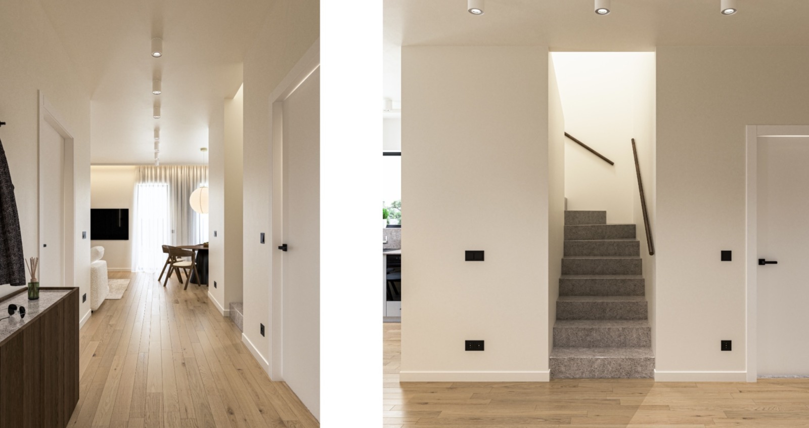 Къщите са изпълнени в съвременен класически стил с подчертани хоризонтални линии, светла фасада и прецизна геометрия. Интериорните решения са разработени в мек, естествен цветови диапазон с внимание към обема и светлината.