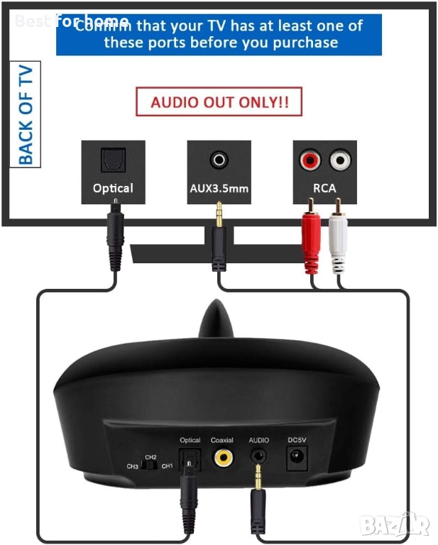 Съвместими устройства Телевизори, DVD и Blu-Ray плейъри, DVR устройства, сателитни приемници, A/V приемници, лаптопи, компютри, MP3 плейъри, LCD, плазмени и стандартни телевизори с AUX/цифрови оптични/коаксиални/3.5 мм или RCA аудио изходи