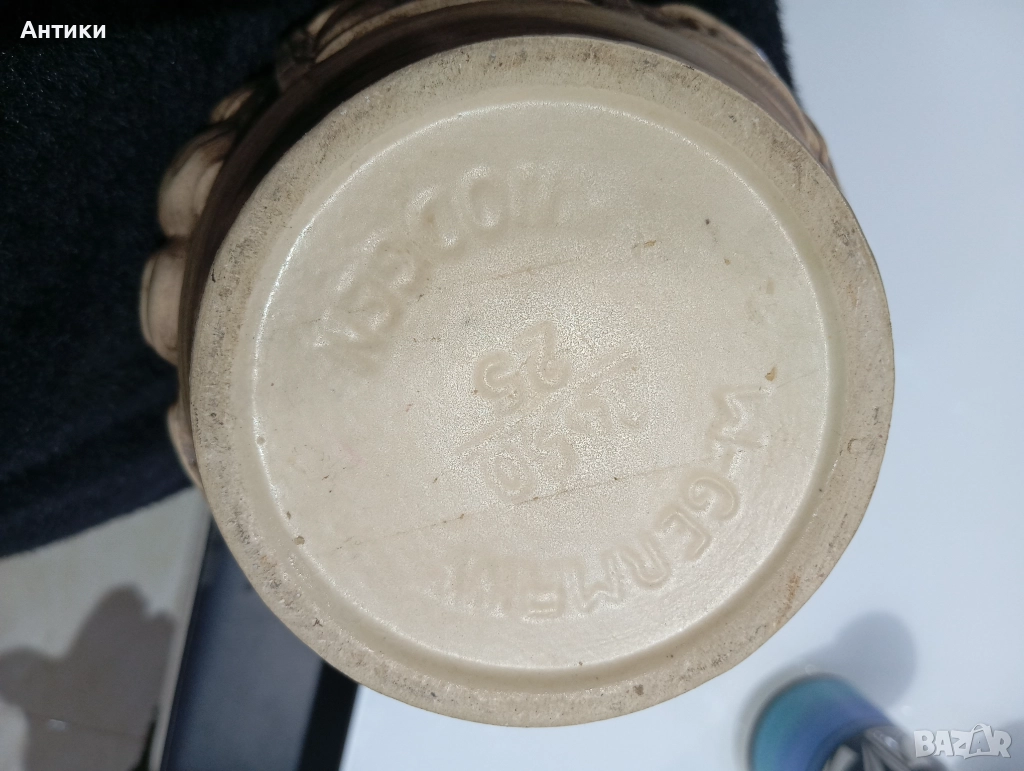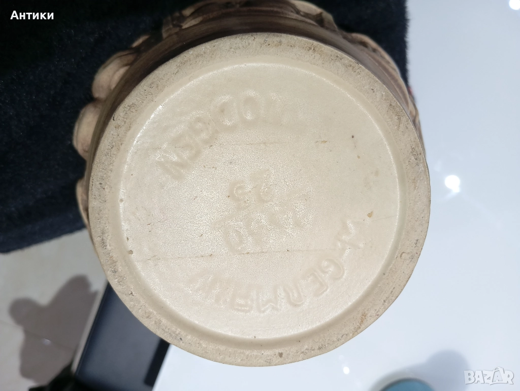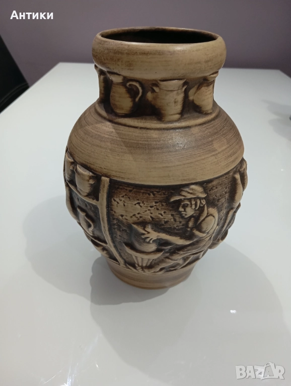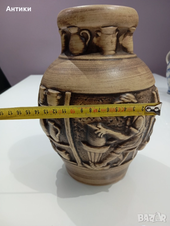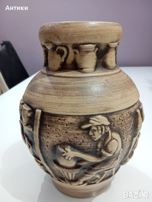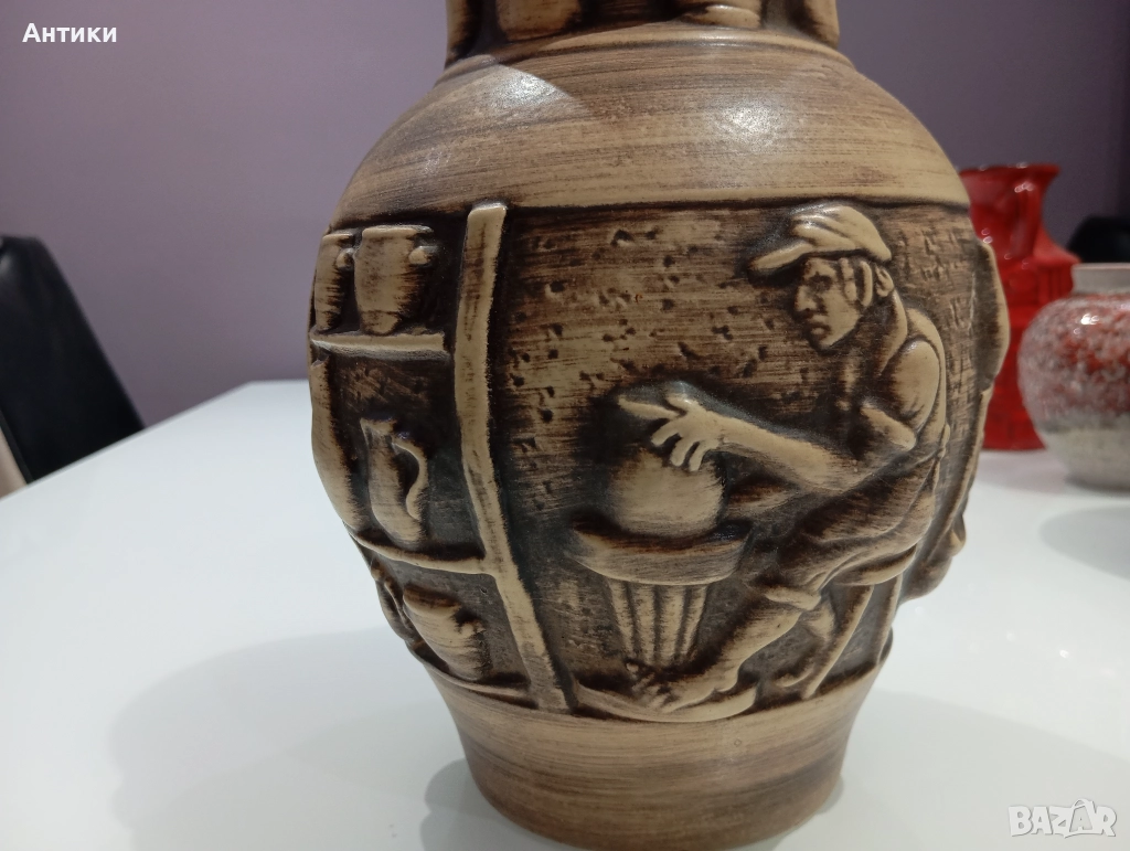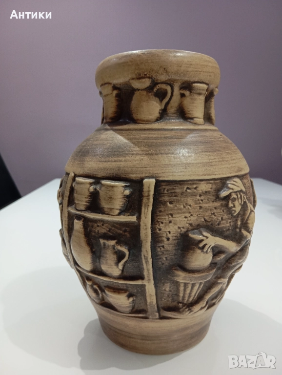Вазата изобразява релефно грънчар, седнал на колелото си в работилницата.