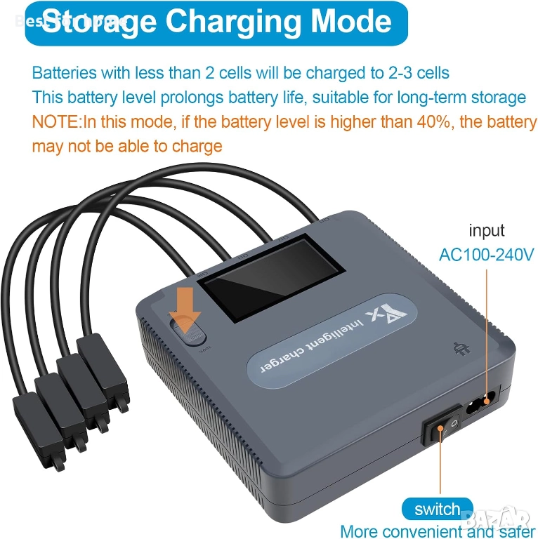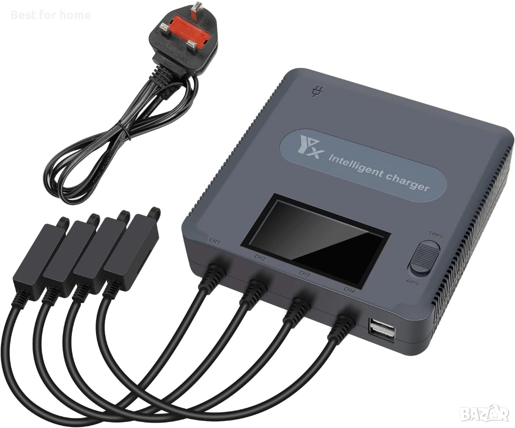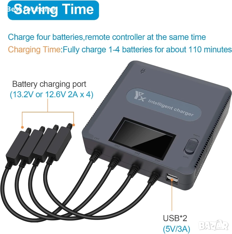 Може да зарежда едновременно 4 батерии и дистанционно управление. Пълното зареждане на 4 батерии отнема само 110 минути.