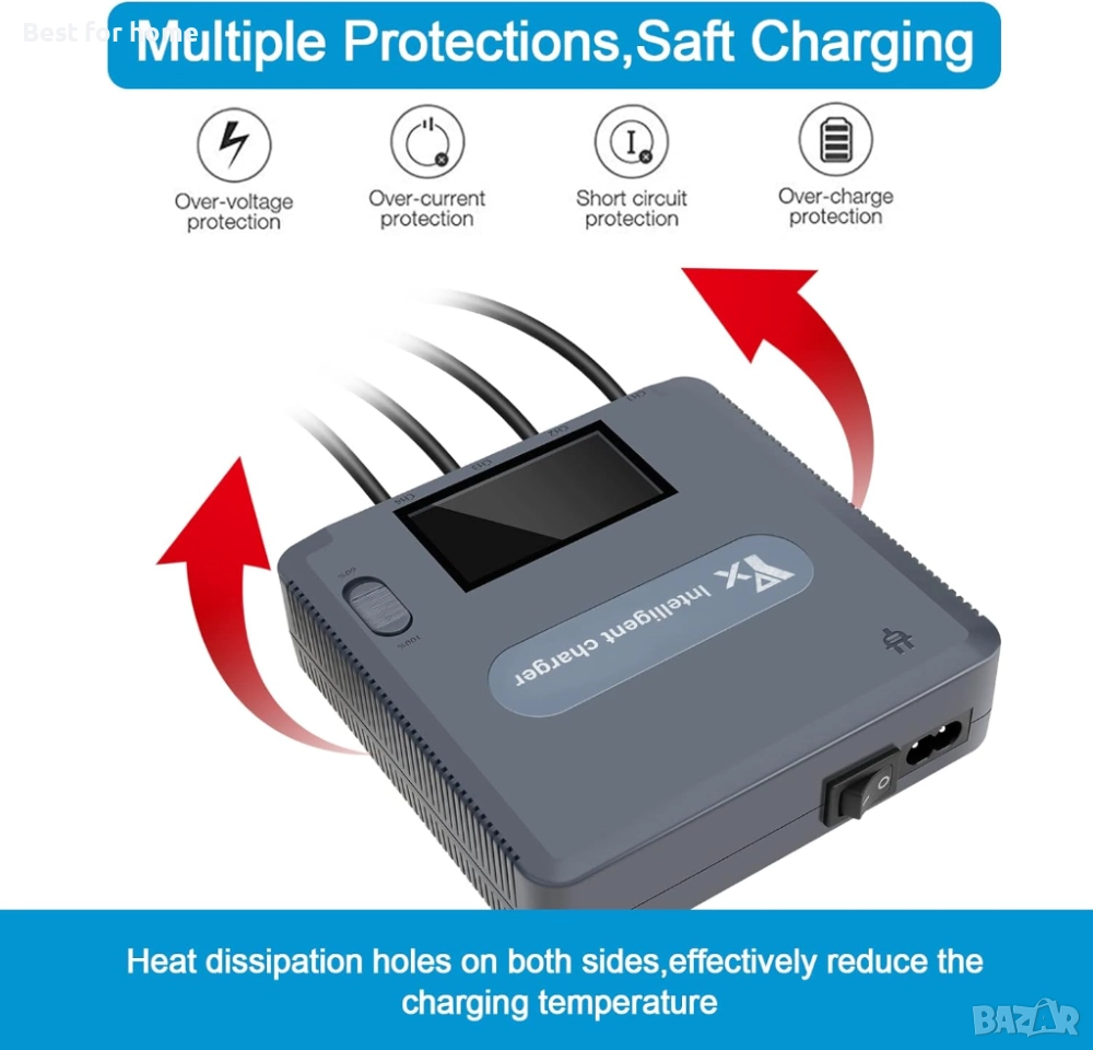 【Характеристики на продукта и защита за безопасност】Изграден с оформени подложки на дъното, които предотвратяват надраскване по дъното на зарядното устройство. Повдигнатите подложки и отворите за разсейване на топлината от 2 страни спомагат за намаляване на температурата на зареждане. Вградената система за безопасност напълно защитава зарядното устройство от презареждане, пренапрежение, претоварване с ток и късо съединение.
