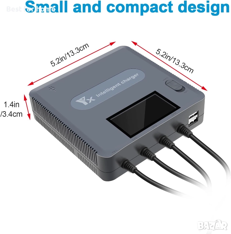 Вход: 110-240V; Изход: 13.2V/12.6V 8A (разклонение: 13.2V/12.6 2A, 2A, 2A, 2A); USB изход: 5V 3A