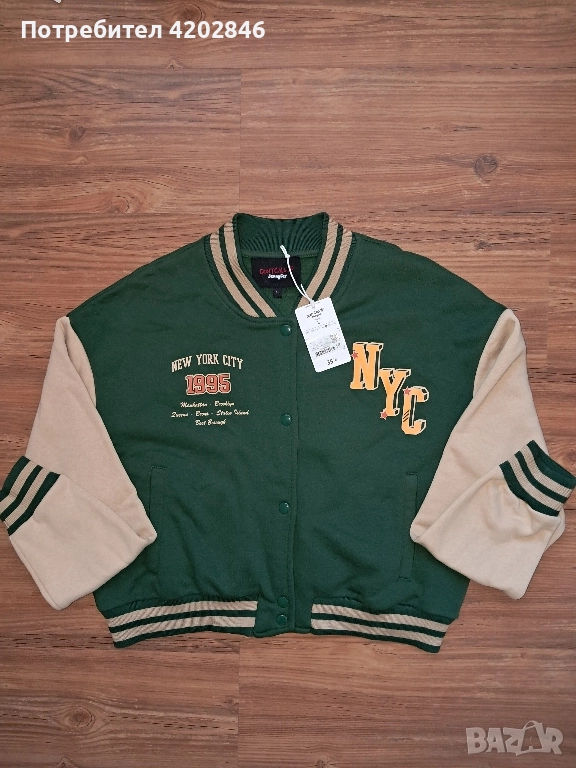 Зелено - бежово дамско графично яке, тип " Varsity ".