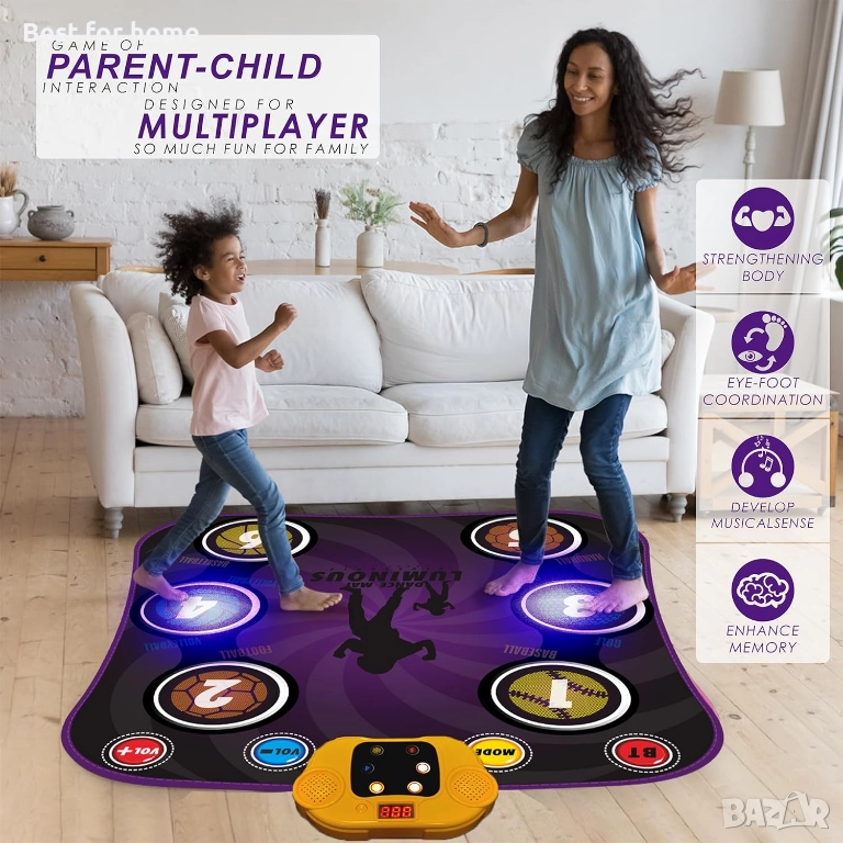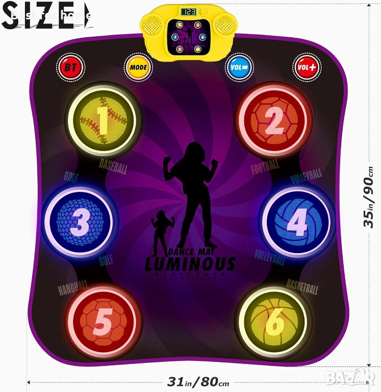 6 ЦИФРОВИ КЛАВИША И LED СВЕТЛИНИ: В сравнение с танцовата постелка със стрелки, тази танцова постелка е оборудвана с 6 красиви цифрови клавиша, за да направи танците по-забавни. Тези 6 цифрови клавиша могат също да светят, за да накарат децата ви да се забавляват с танците и упражненията.