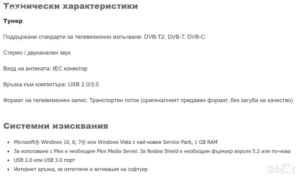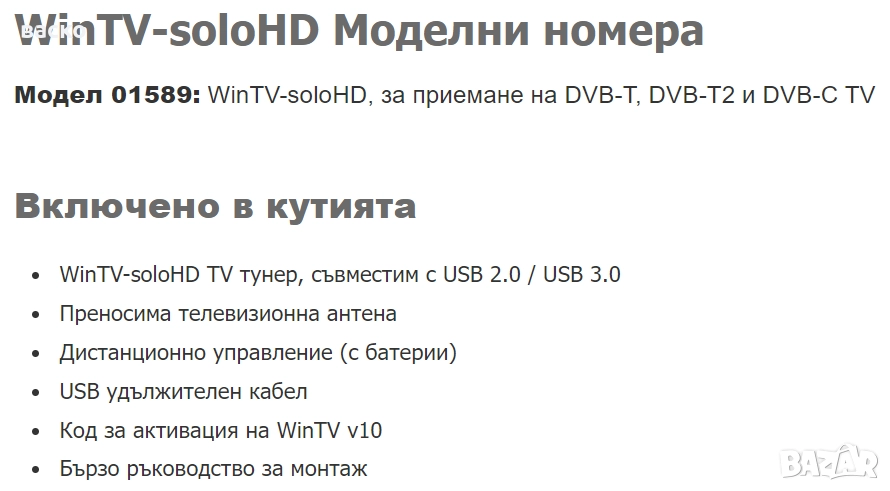 Поддържани телевизионни стандарти: DVB-T2, DVB-T, DVB-C; VHF-/UHF обхват
